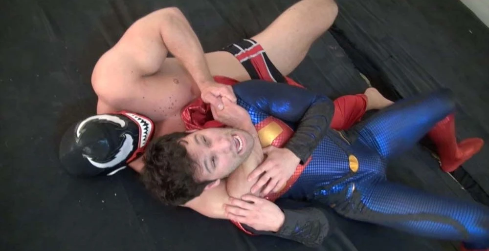 Stud’s sweetly outlined ass rumbles in his spandex with each punch he throws. But for as good as things are looking, Symbeite still promises to regain the upper hand. Even while locked in a Full Nelson submission he declares, “When I get loose I’m going to suck so much power out of you!” And loose himself he does, with a moment of separation, Symbeite seizes the opportunity, hoisting Stud into a super-sized Bear-hug! Super Stud gets drained and crushed simultaneously, the worst type of onslaught. Somehow Stud’s bulge seems to maintain its virility, expanding as if to compensate for his spinal constriction at the hands of his foe.