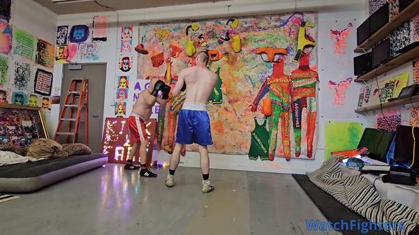 In this pro-style match, Feisty is fitted in his emerald green trunks and pads, while Puppy-J is rocking his purple and black trunks and his signature puppy mask and harness.