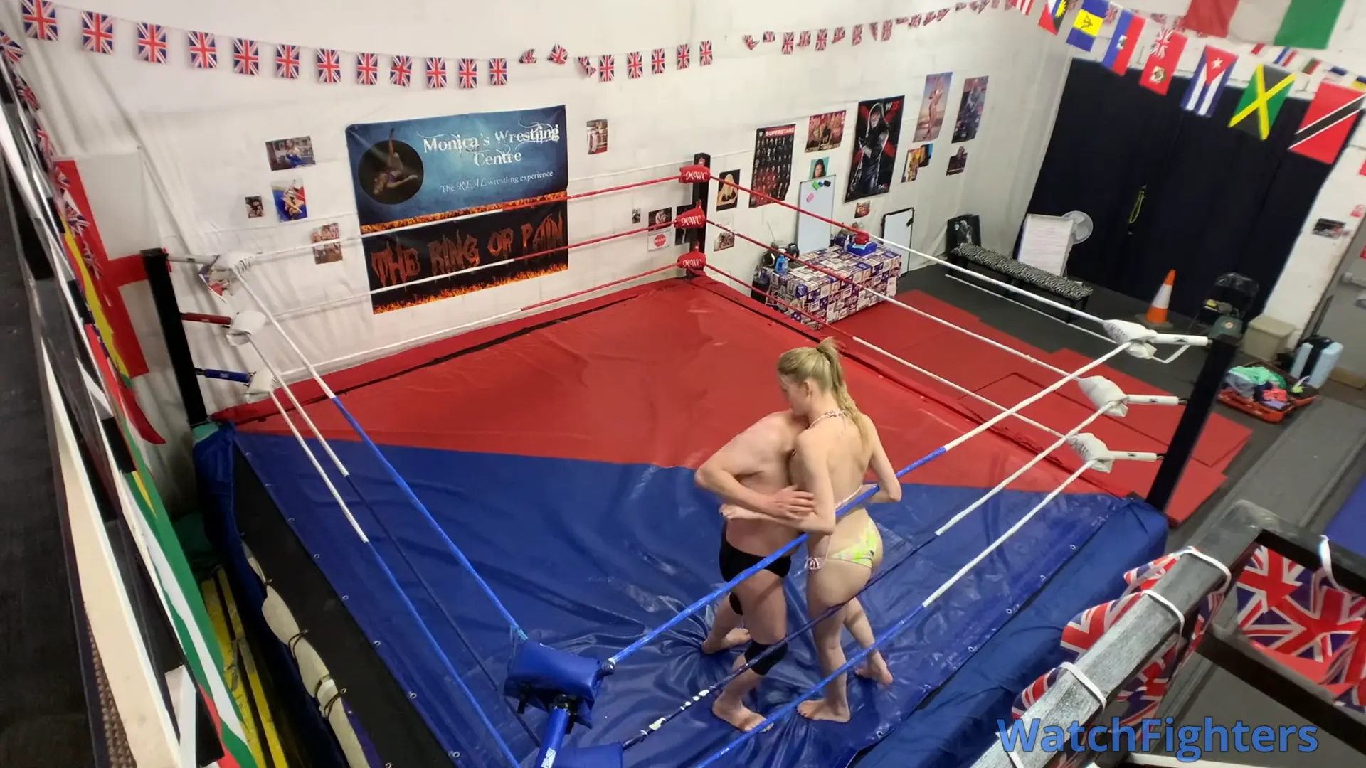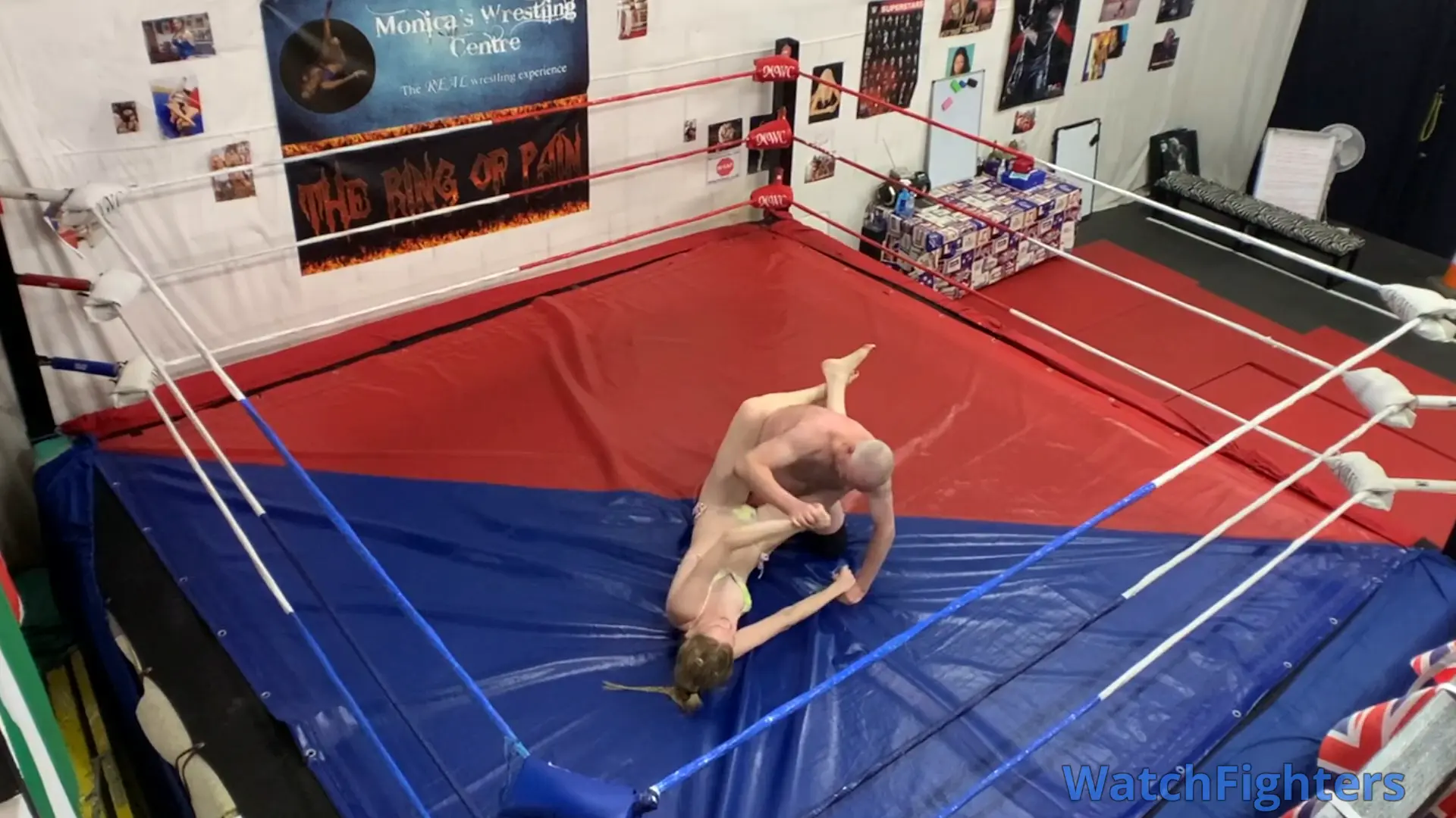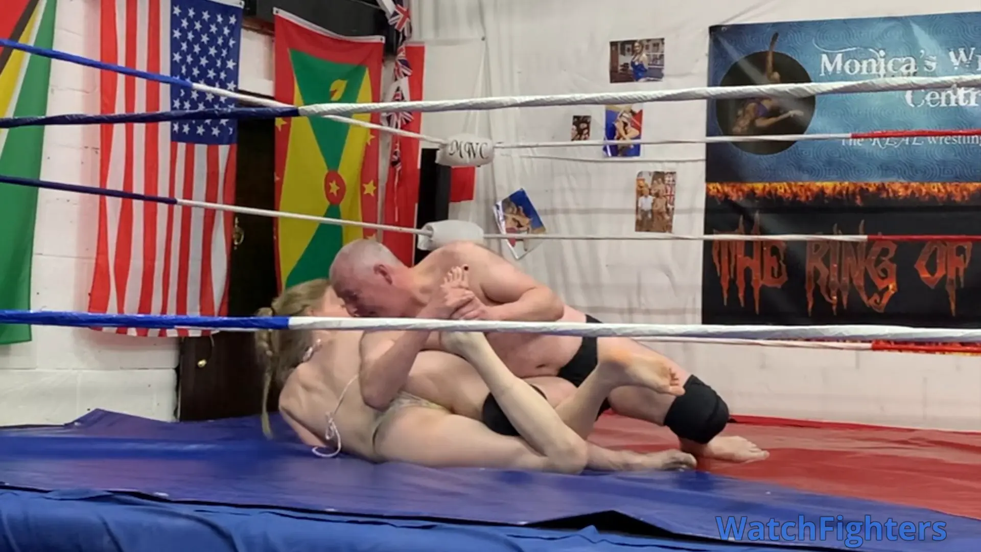 Action from a competitive mixed wrestling match featuring the statuesque amazon, Nausi v Stephen held at MWC London.