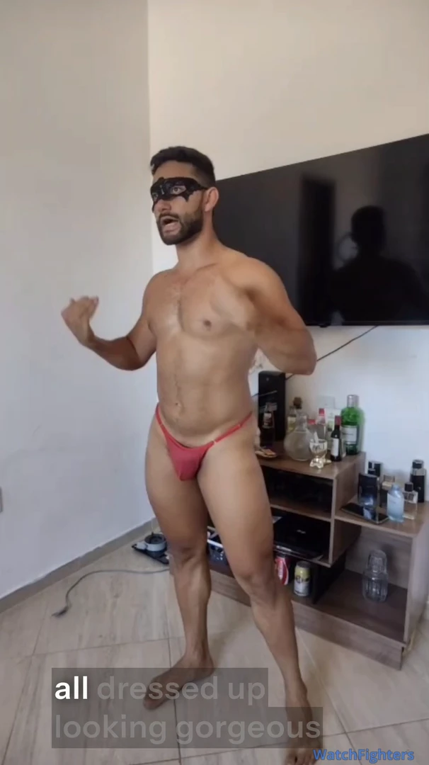 Gay afeminado exibindo seus grandes quadríceps musculosos e explicando como destrói os machos gigantes, usando uma tanga super pequena