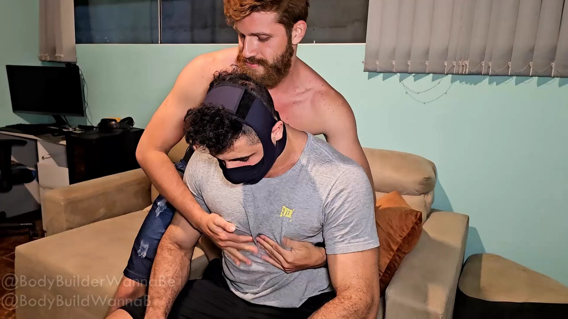 The video opens with a massive, masked bodybuilder sitting calmly on a sofa. A smaller, yet athletic, man approaches him from behind and begins to remove his t-shirt, revealing an impressive, muscular physique. The admirer wastes no time and begins an intense session of muscle worship, focusing entirely on the bodybuilder's enormous pectoral muscles. He passionately rubs, kisses, and licks the massive chest, showing his deep admiration. The action escalates as the admirer buries his face into the bodybuilder's pecs, biting, sucking, and twisting his nipples with increasing fervor. The bodybuilder stands tall and flexes, showcasing his incredible size and definition, while his admirer continues his devoted worship, eventually moving to his knees to continue his adoration of the powerful torso.