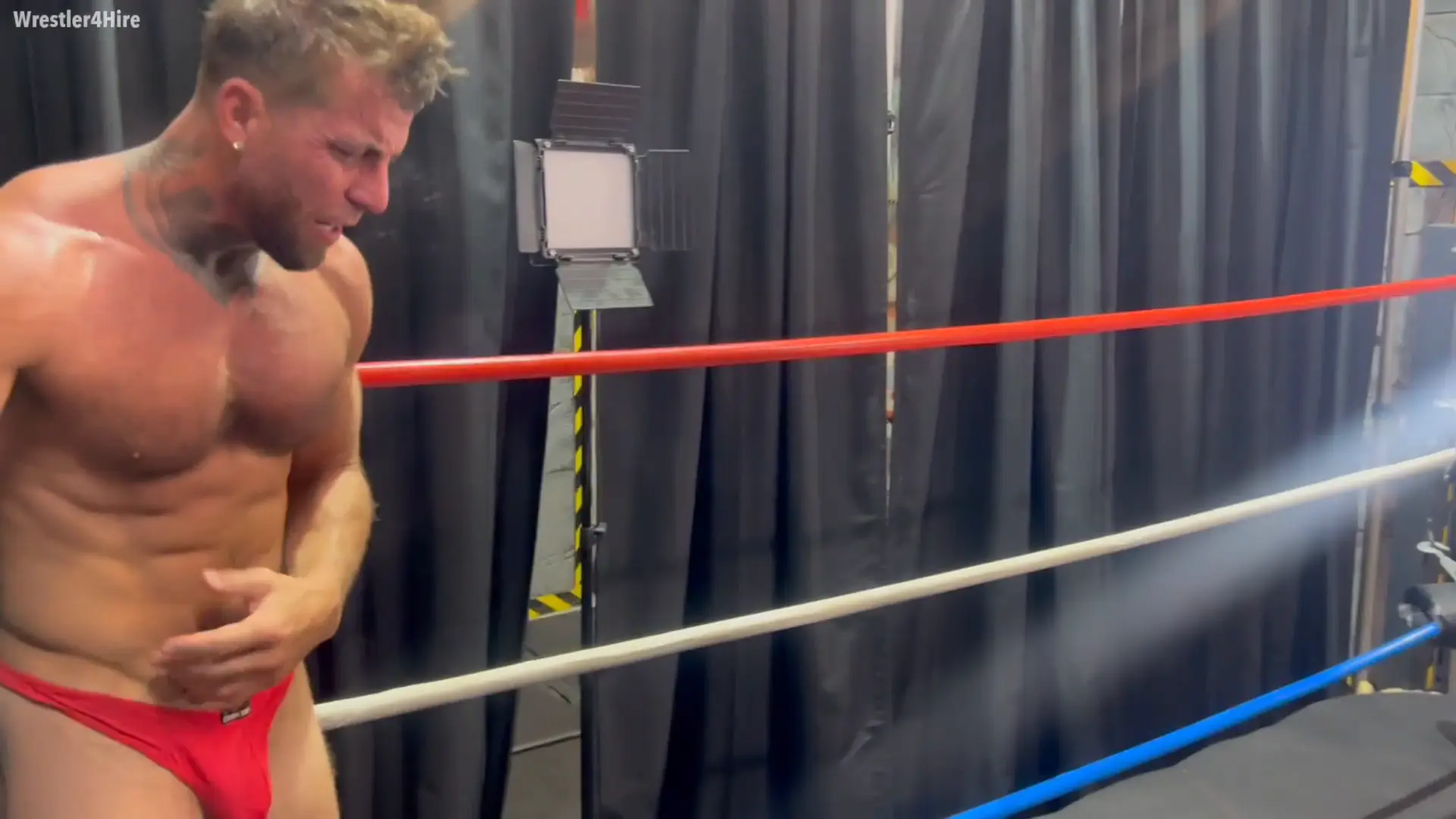 Cash, a tall bodybuilding hunk, is in the ring, every inch of his massive, sculpted frame glistening under the lights. His bright red thong clings to his shredded physique, begging for attention as he stretches and flexes his powerful muscles.