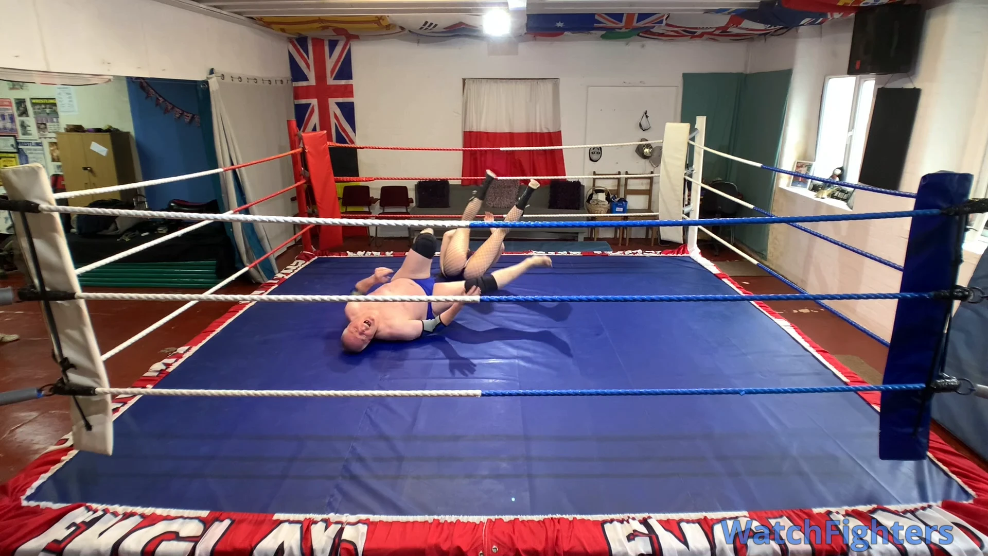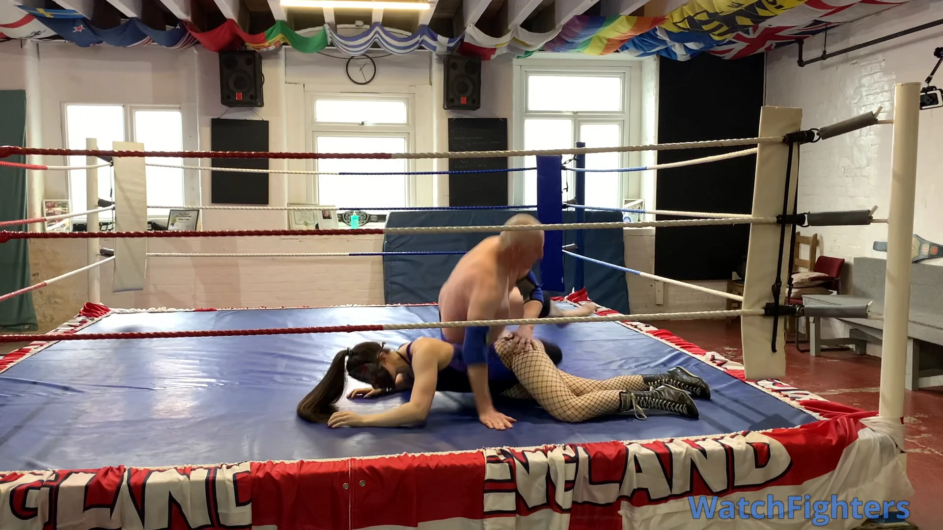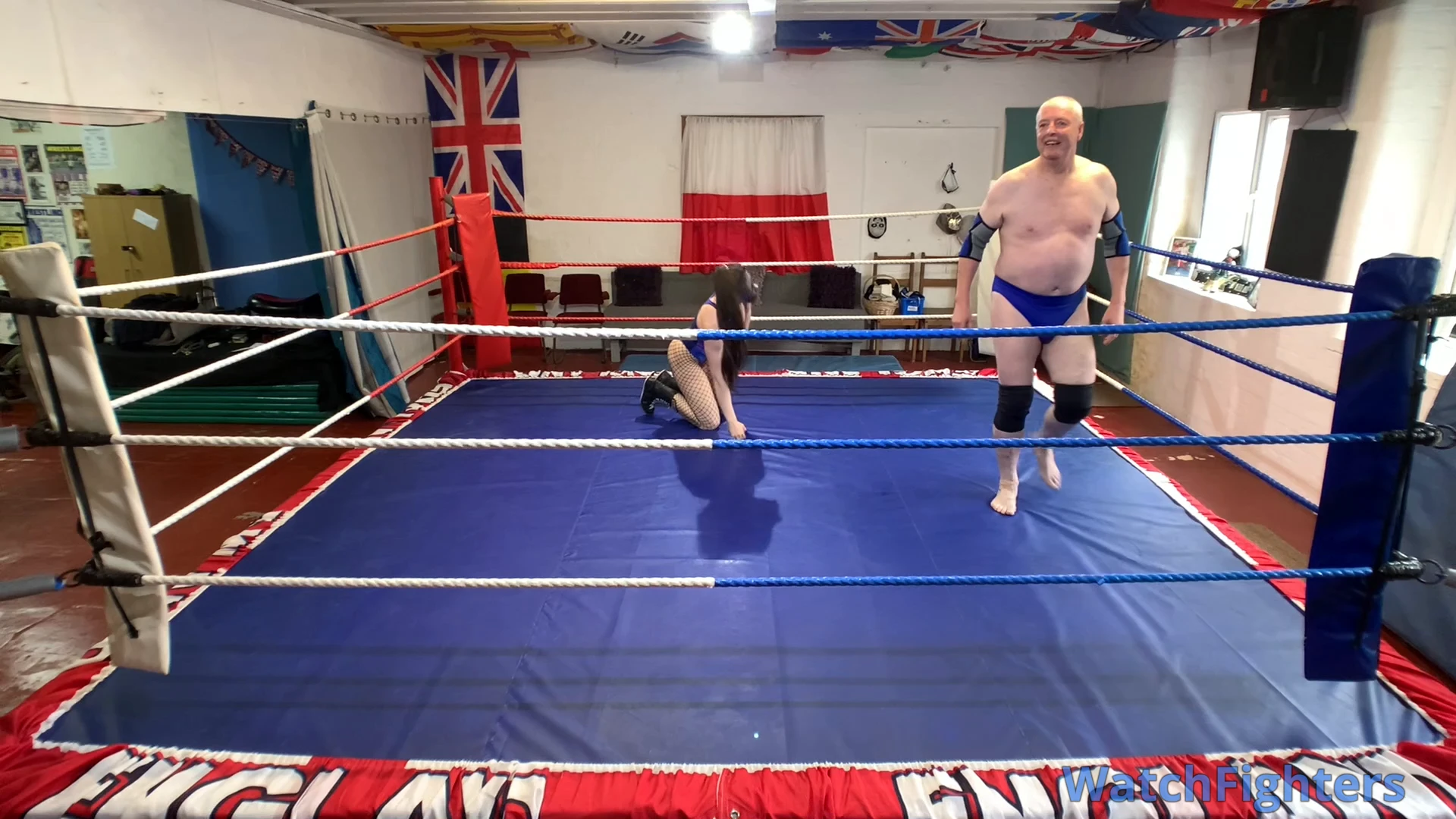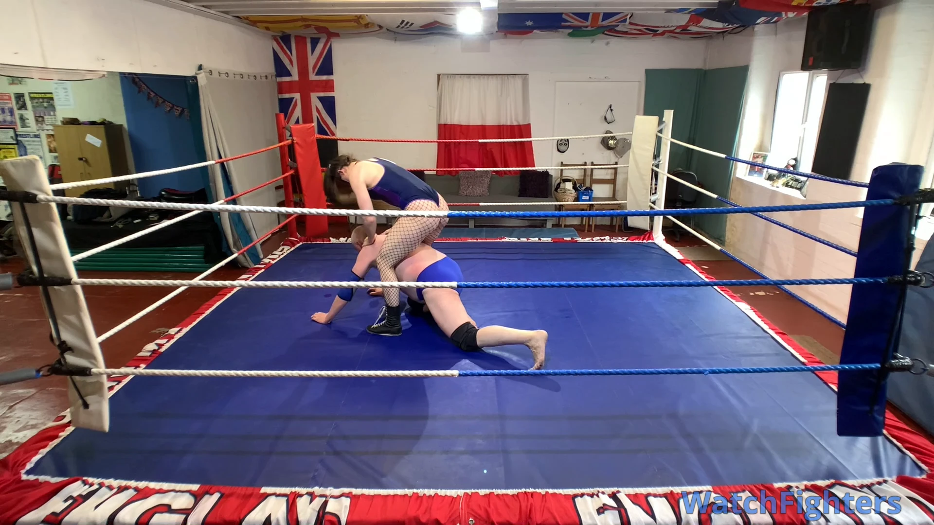 Action from a pro style mixed wrestling match featuring female session wrestler Miss Monster v Stephen held at TWF Manchester.