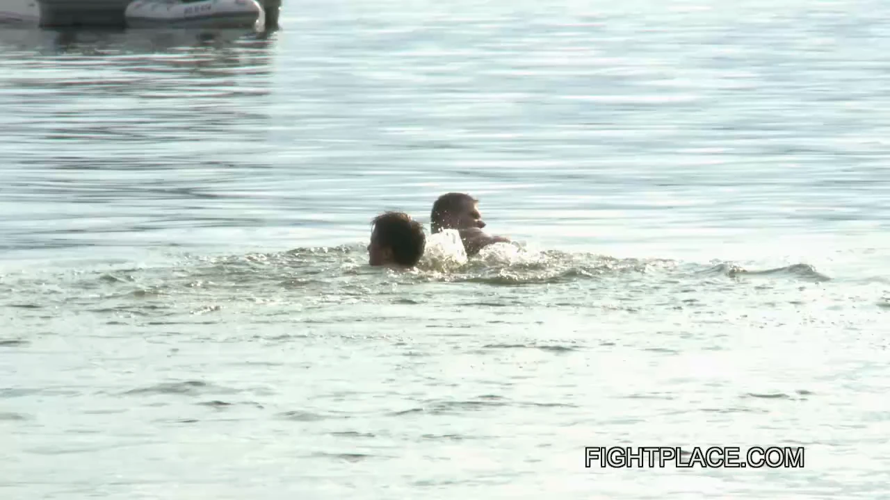 A heated fight breaks out between the two Latvians on the beach. They strip off their shorts and try to dominate each other with schoolboypins and bully pins, intense “cock-to-face” moves, and long holds. Just as Yan is about to defeat the smaller Alex, Alex jumps back into the water and swims to the boat.