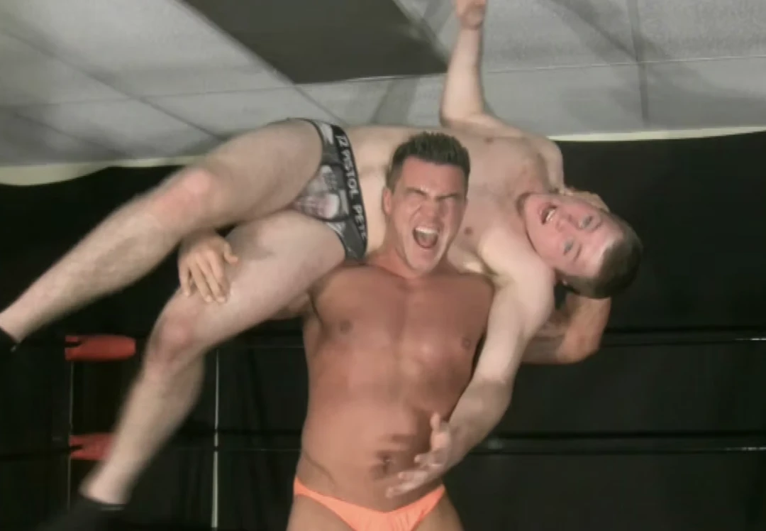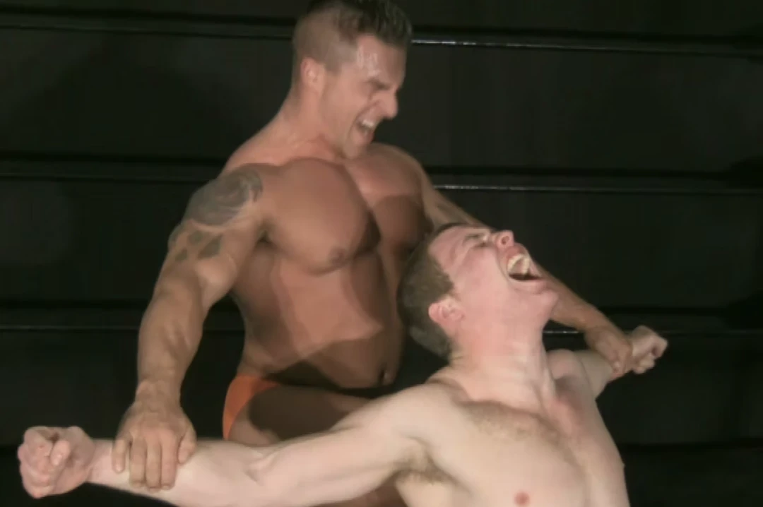 The hunks clinch, exchanging knees. The bodybuilder muscles his prey into the corner with a big bear hug. Law wrenches his way out of the bear hug after a lengthy struggle. Charron pacifies the jobber with a massive power slam followed by a Boston crab. Tony escapes and lands a quick single leg takedown but is not strong enough to maintain the advantage, his power having been drained by Braden’s life sucking offense. Charron lands huge knees to Tony’s gut before applying a Camel Clutch. Tony fights out only to be caught again by a more aggressive application of the hold. This time Charron shouts in rage flexing his bicep “look at that the size of your fucking face.” The resilient jobber bitch continues to talk shit even while bent wholly too far backwards in a Camel Clutch. Braden loses his temper and begins to unleash a far more sadistic onslaught than he has previously administered. Something about Law’s shit talk sends the big bodybuilder into a massive rage that has the big man unleashing over the knees and alternating single leg crabs. “Remember I’m in control,” the angry bodybuilder snarls. “This is my fucking ring.” As the beat down heats up Charron shows Law who the fucking man is, as well as identifying the bottom bitch boy.