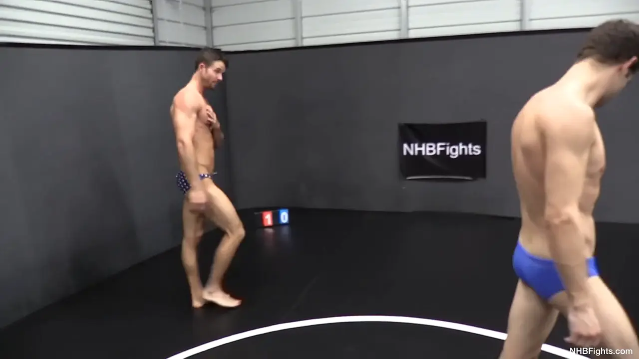 Anybody who has seen the individual work of Blake Starr and John Wolfboy will be able to acknowledge what a perfect pairing this is! Both men are long, lean, tall, tones, fast, aggressive, and dead sexy. Blake Starr shows off his skills in a pair of miniscule American flag speedos, demonstrating pushups and agility. John Wolfboy pivots and stretches with calm focus, demonstrating us amusing facial expressions as he surveys the space once again. Both of these guys are outstanding grapplers. This is gonna be good!