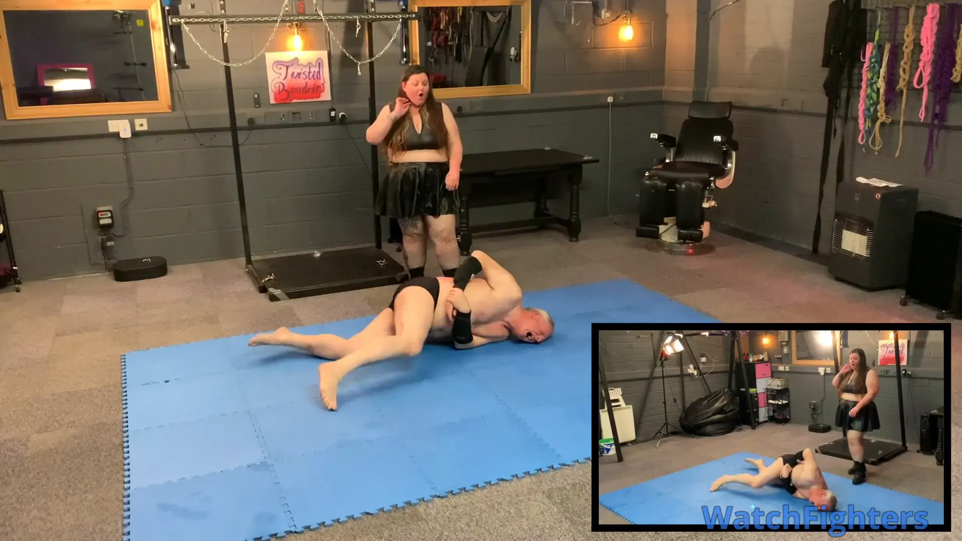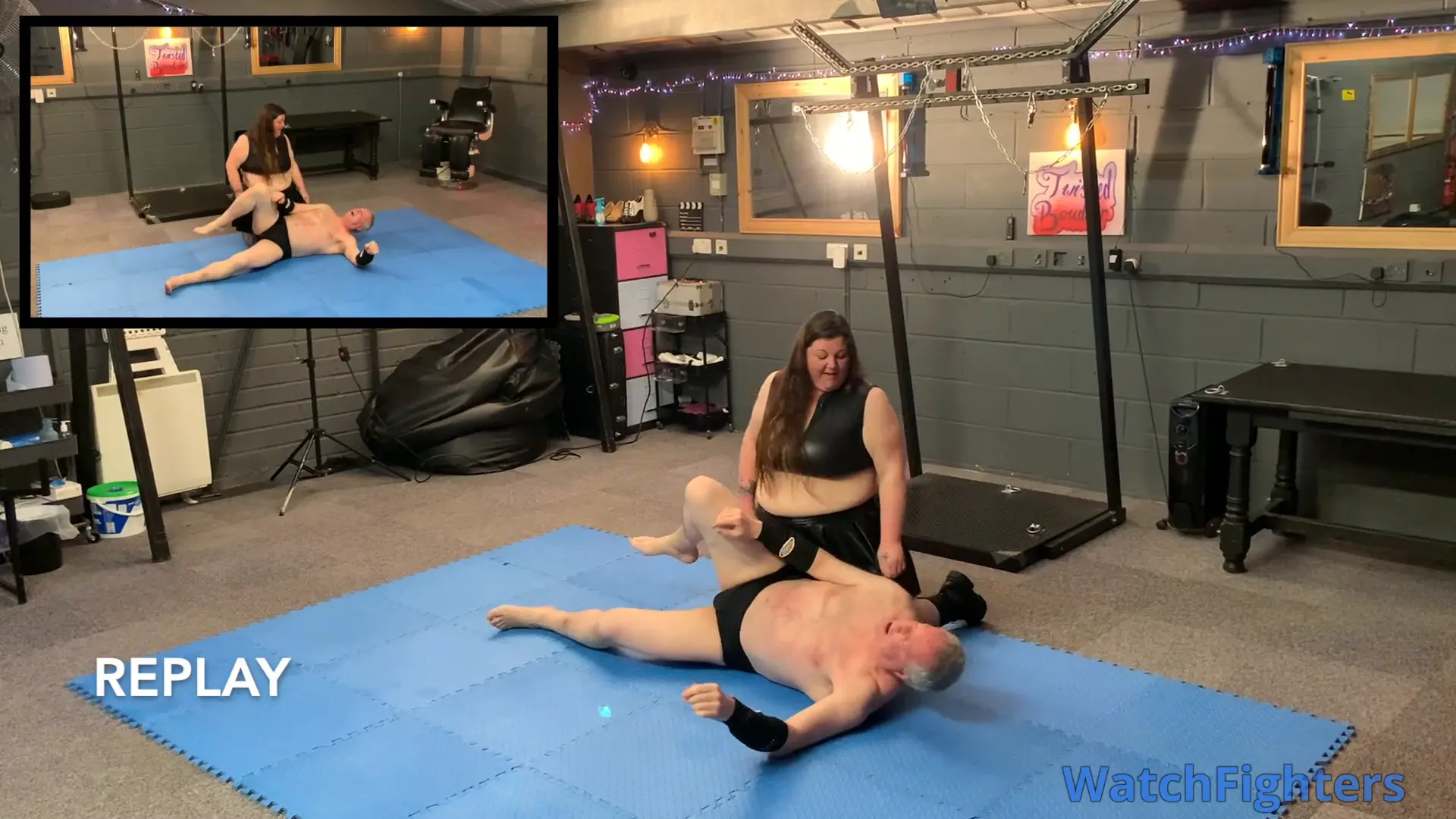 Action from a pro style mixed wrestling dungeon match featuring strong BBW, Kate O'Ninetails v Stephen held at TBO.