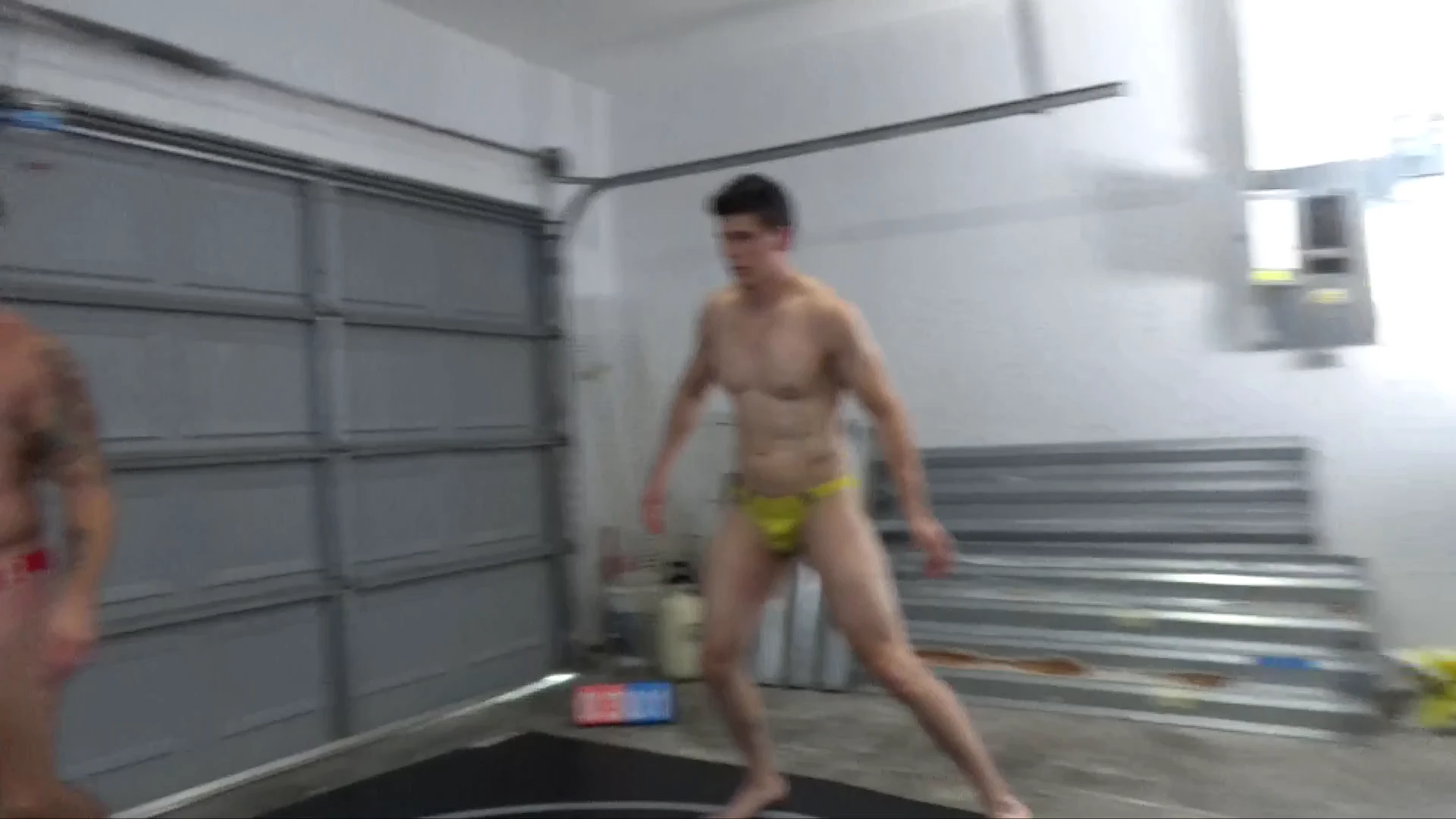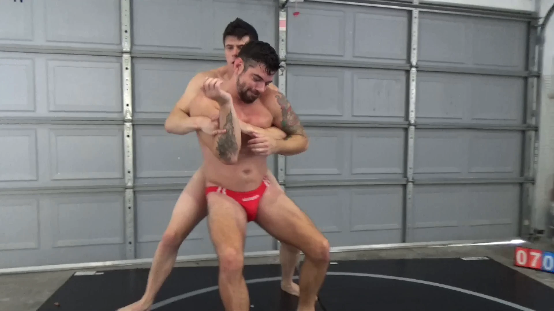 DJ is on the mat stretching as Max joins him. The thing that is immediately noticeable about Max is the number of bruises he already has entering the match (see our “Behind the Scenes” video for more on the stories of those!). DJ has shown that he is quite an accomplished mat veteran, having beat several individuals already. A quick fall proves this out, and the match is on!