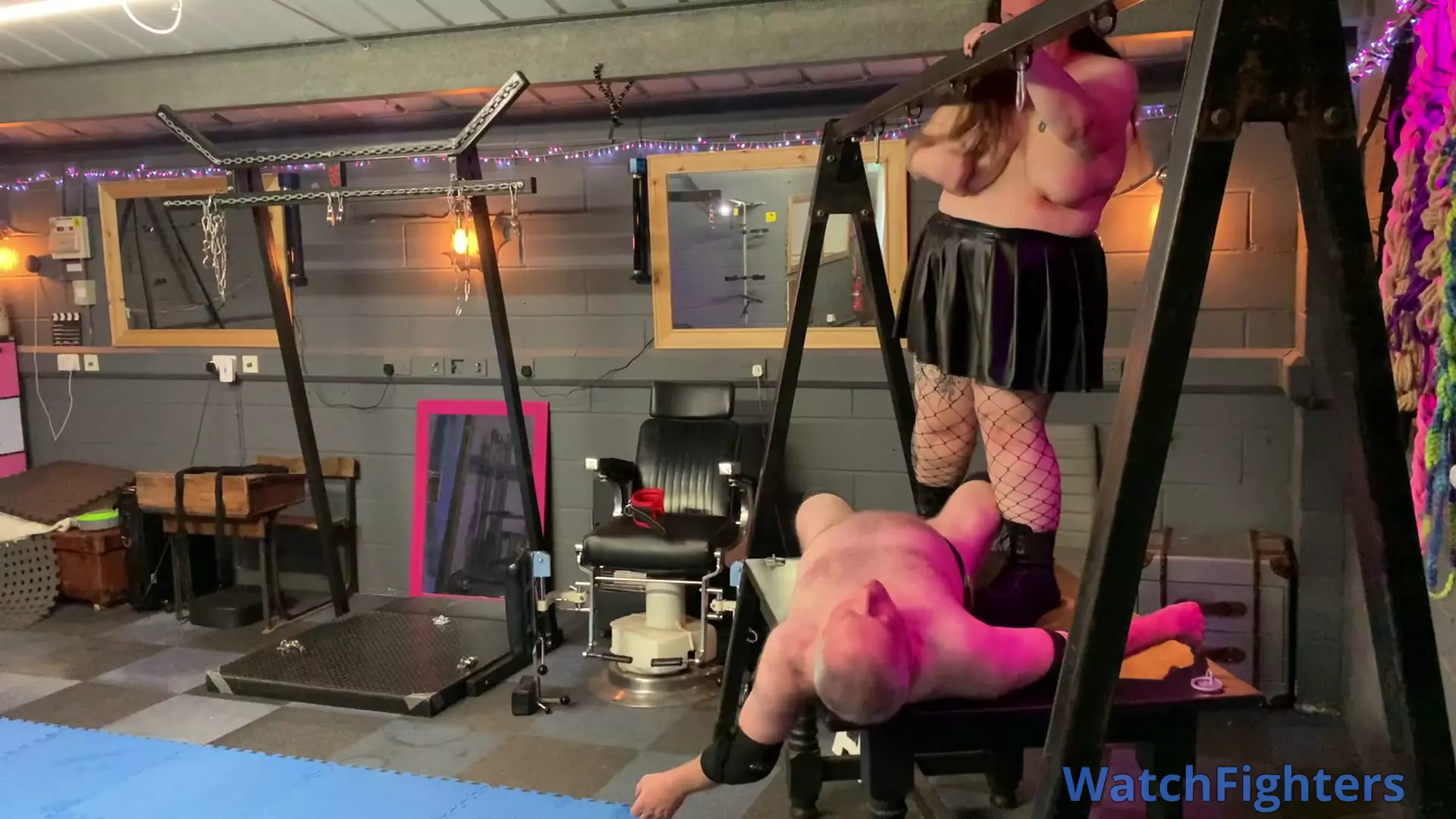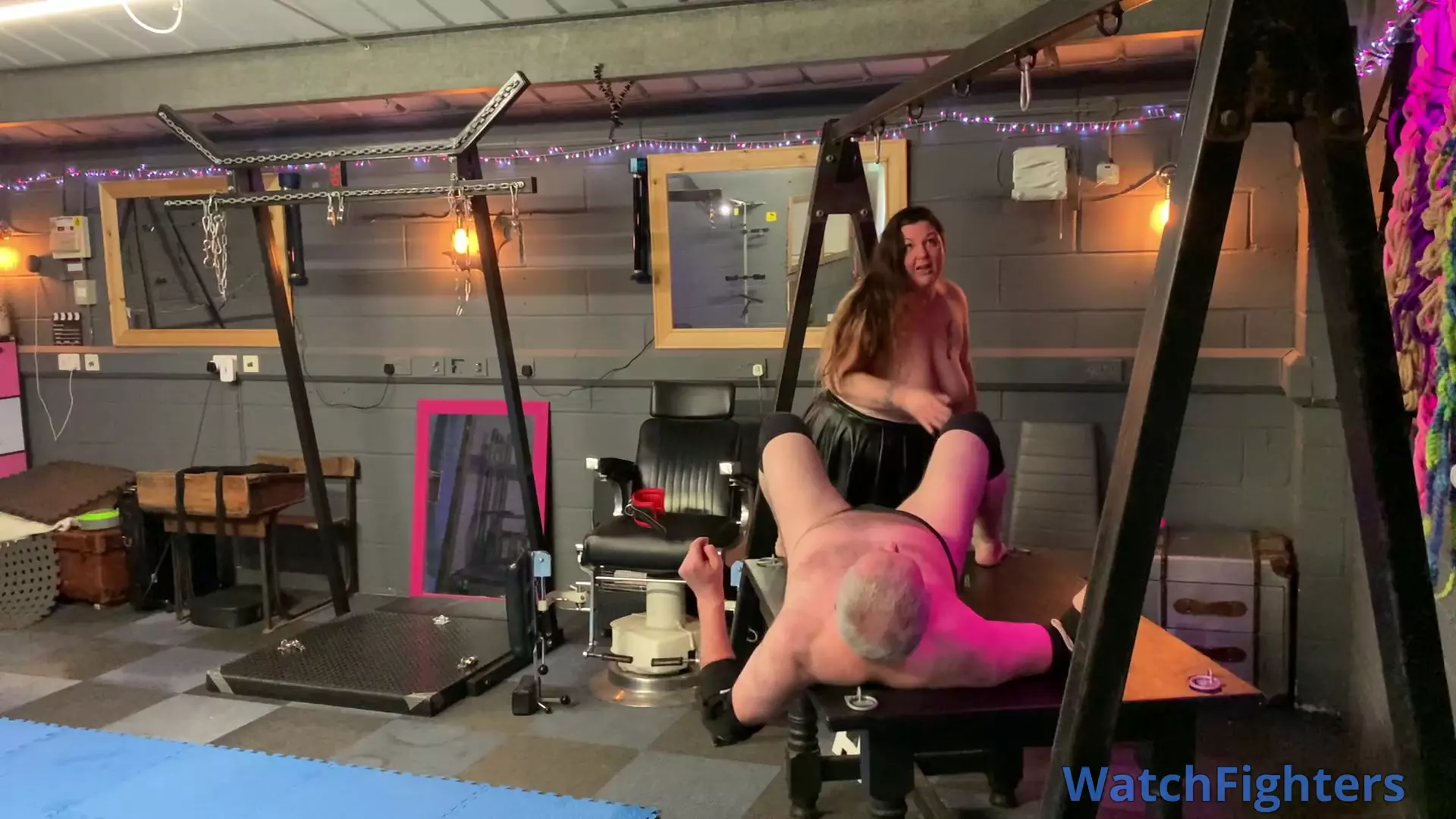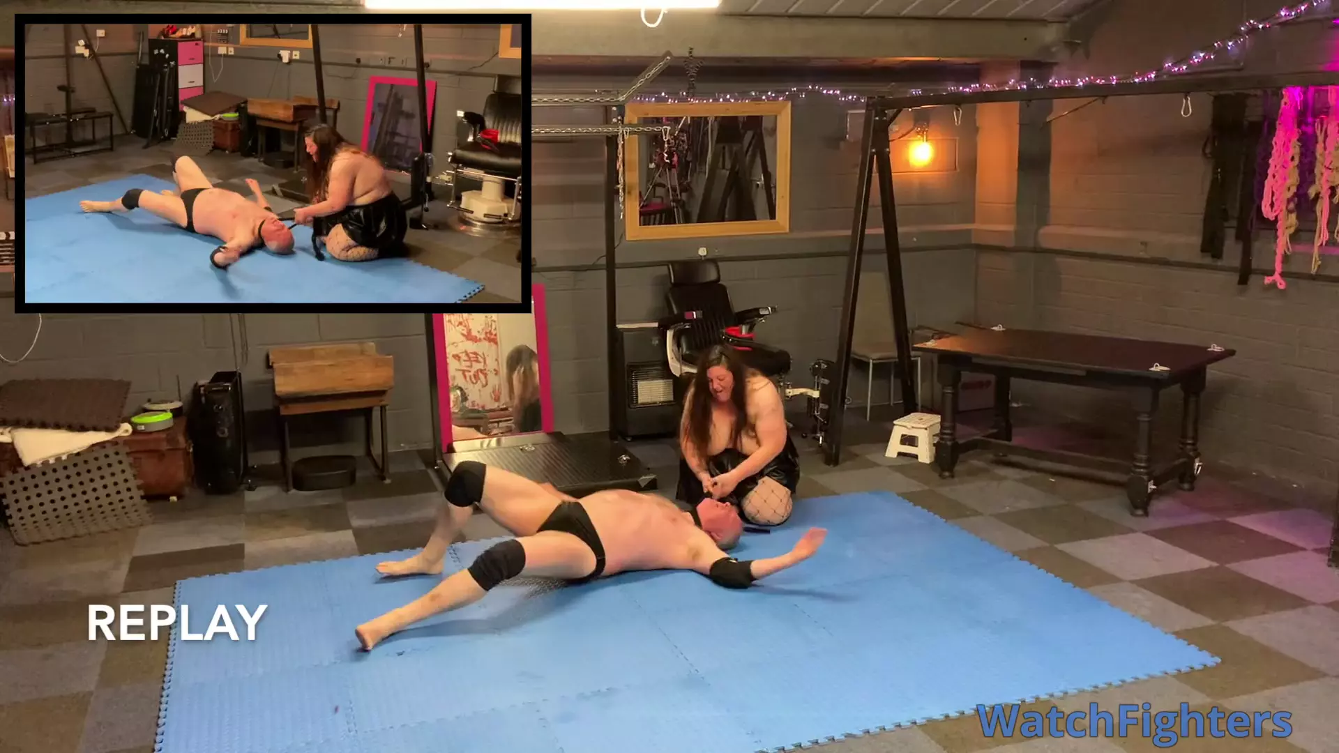 Action from a pro style mixed wrestling dungeon match featuring strong BBW, Kate O'Ninetails v Stephen held at TBO.