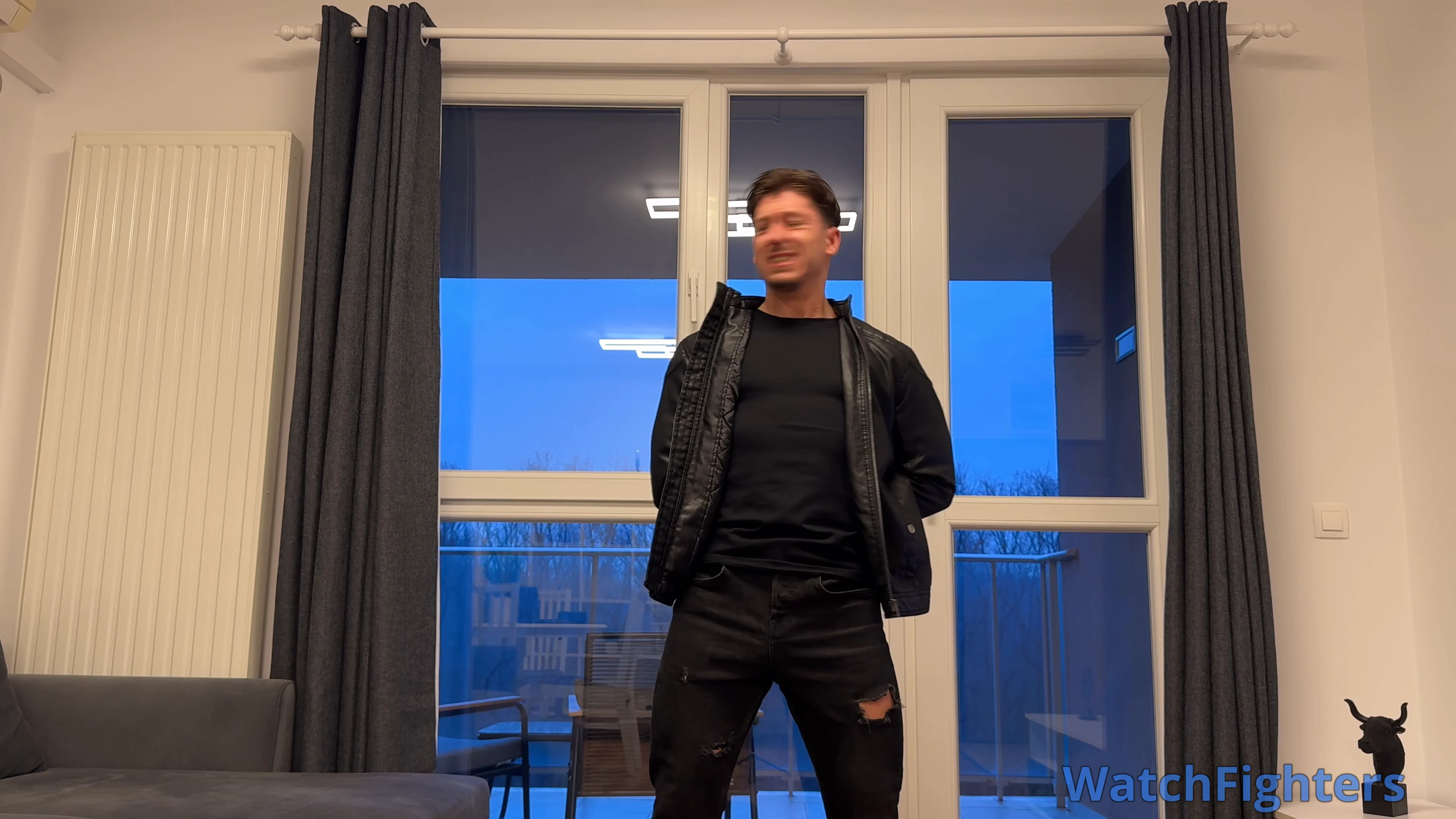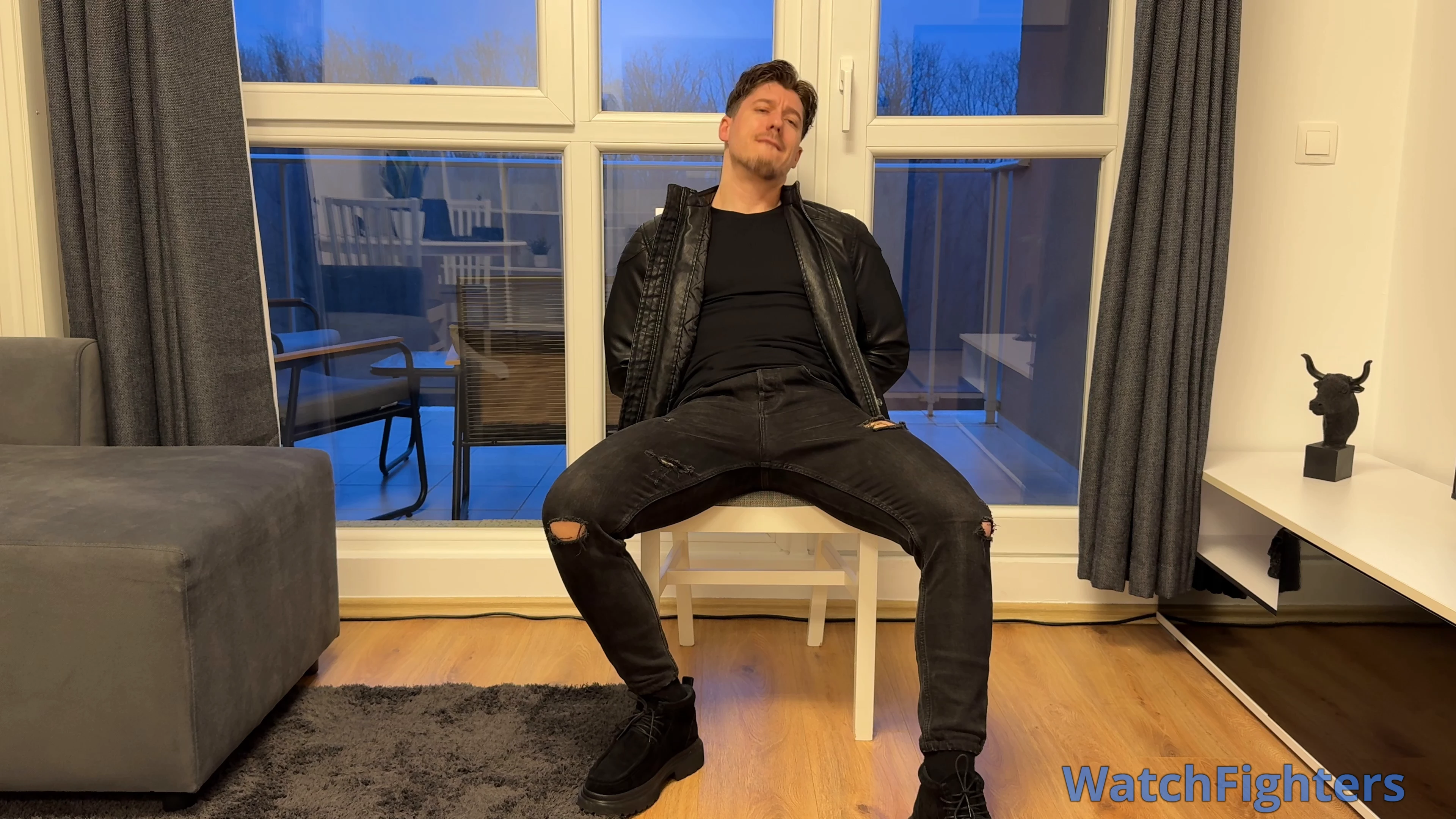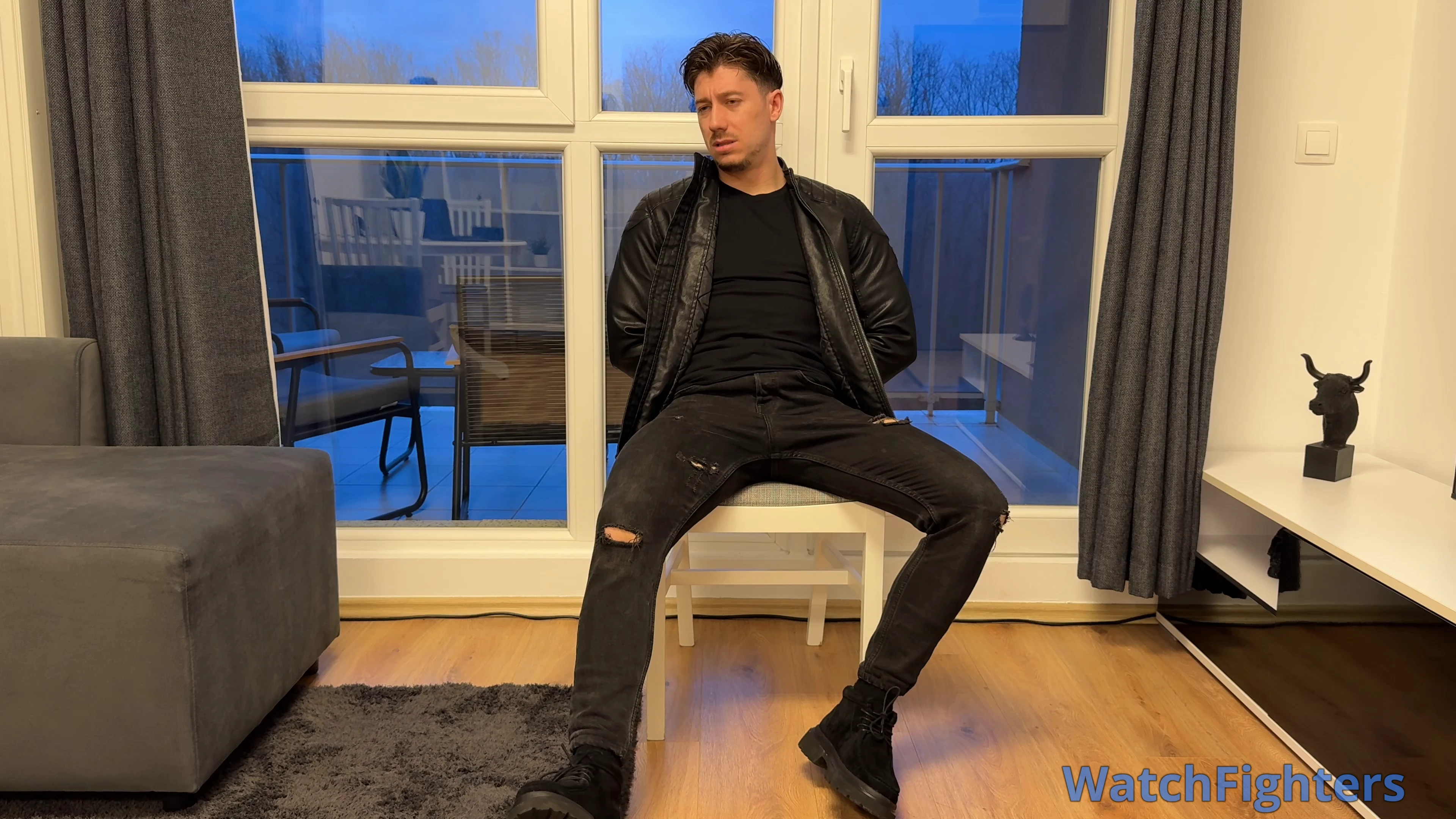 Hunk in leather jacket is captured, tied down and "MADE" by "ALL" means to cum