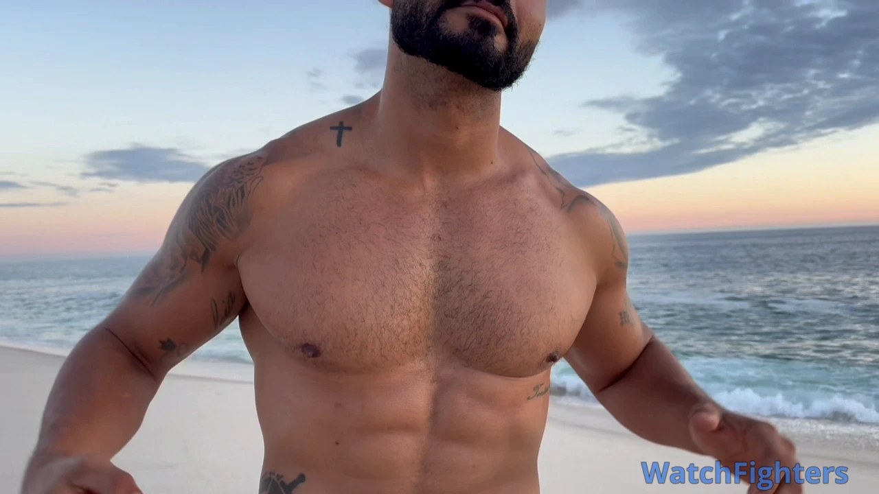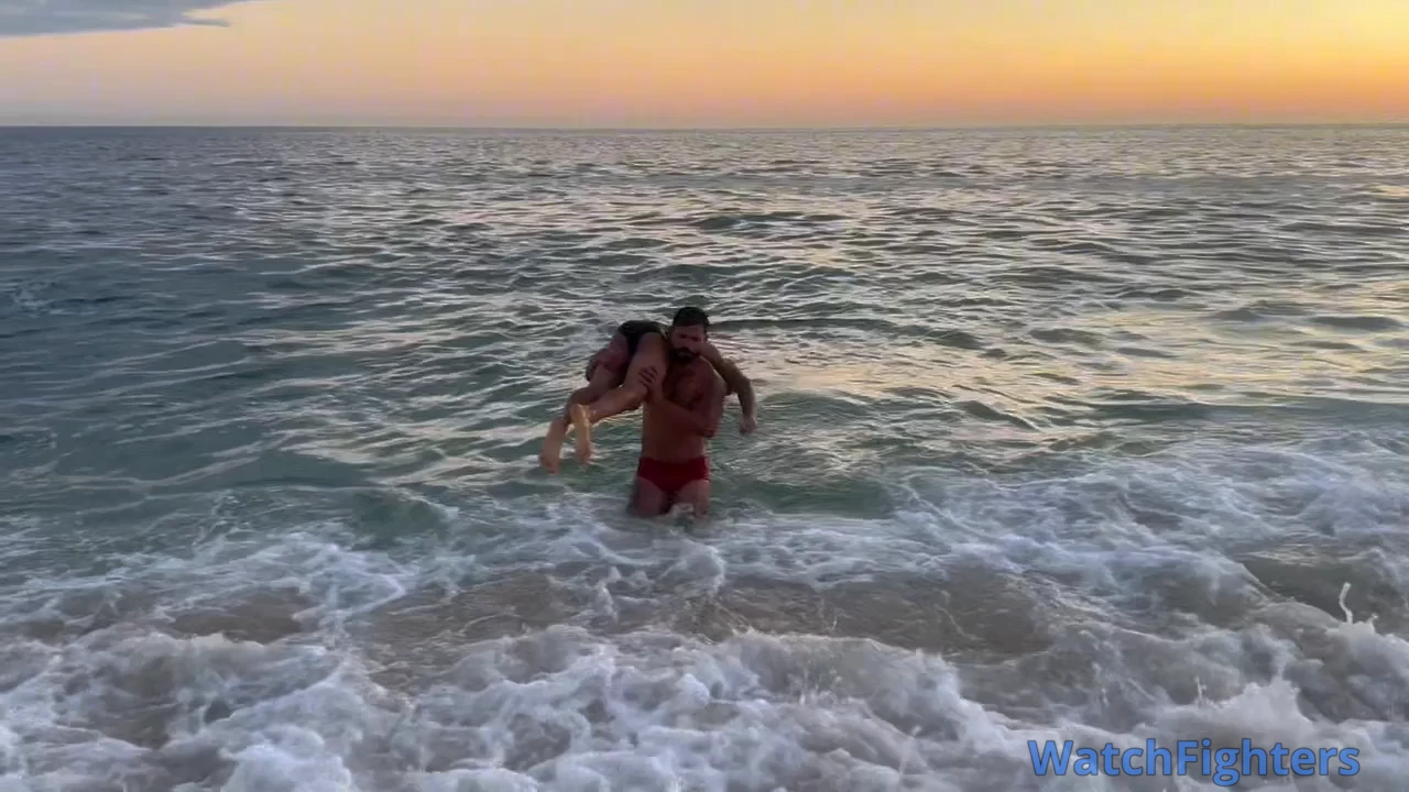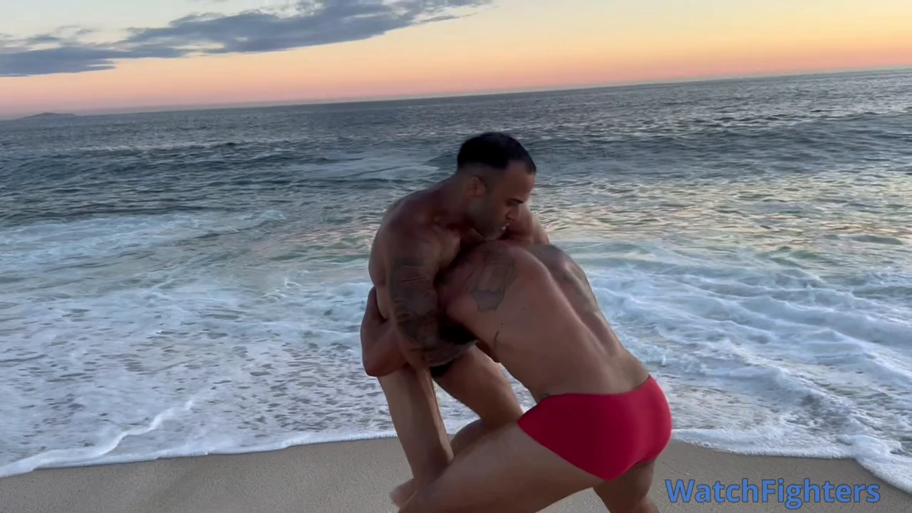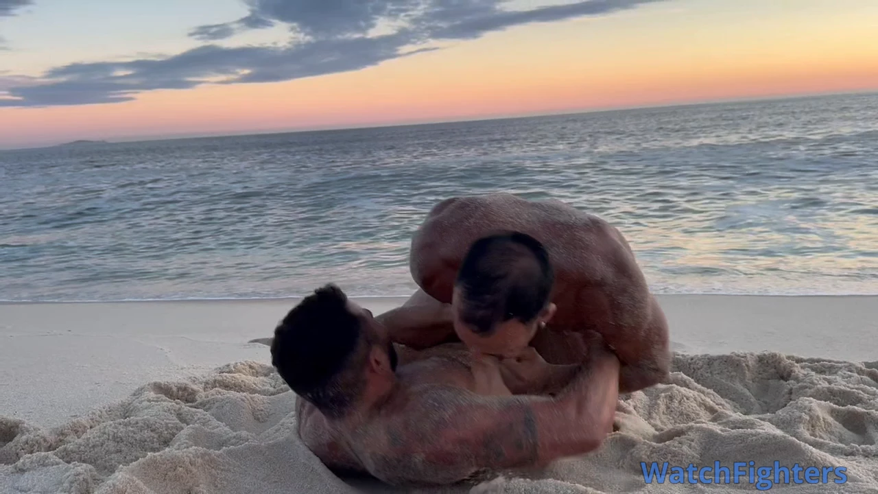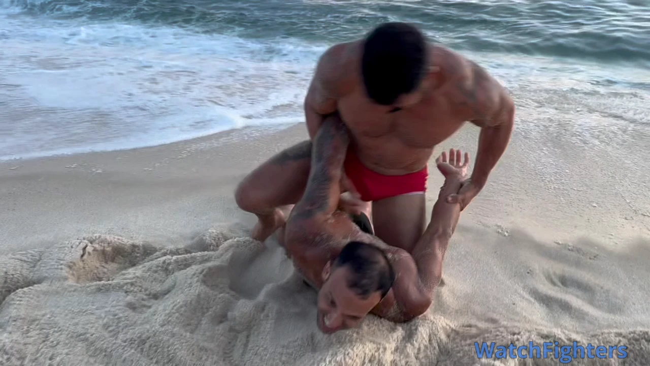 Two powerful fighters collide by the sea in an intense beachside showdown of strength and dominance.