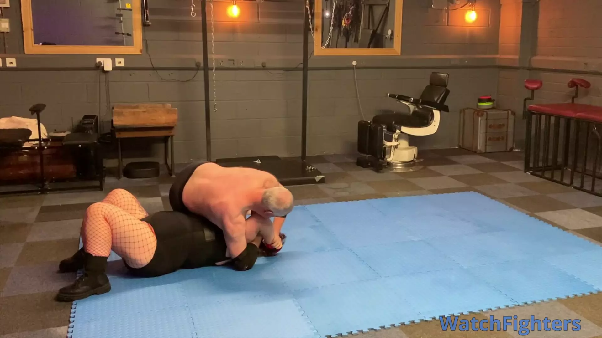 Action from a pro style mixed wrestling dungeon match featuring strong BBW, Kate O'Ninetails v Stephen held at TBO.