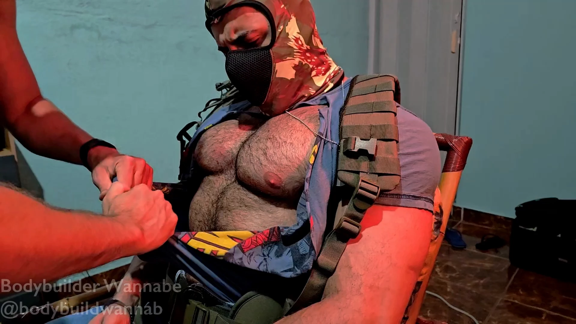Watch as a massive, hairy-chested bodybuilder in military gear gets dominated in this intense nipple worship session. The action starts with his uniform shirt being aggressively ripped open, revealing his enormous hairy pecs.