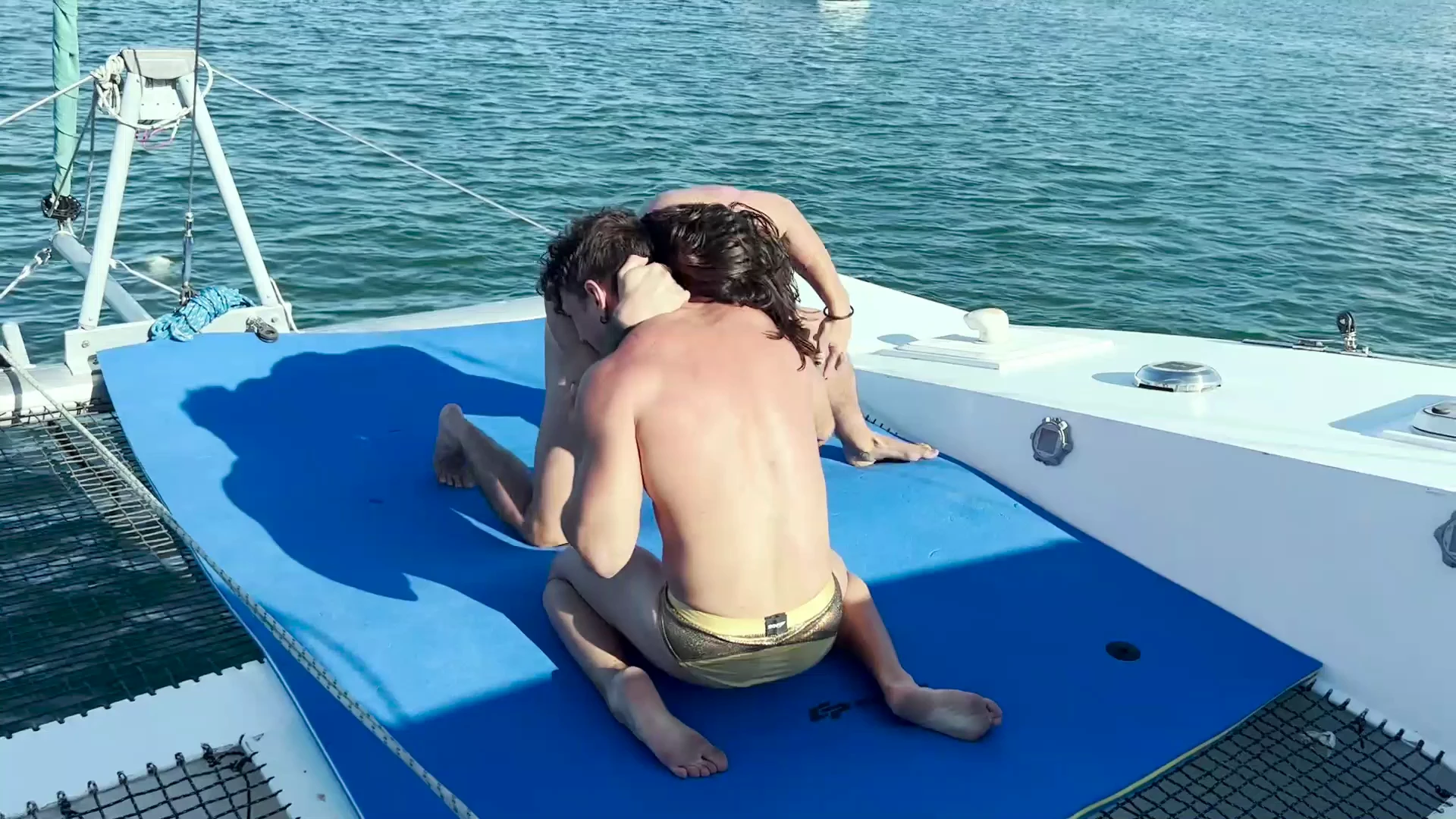 -the next it's all tight control on the mat with legs wrapped, weight pressed down, and a man getting worked while the ocean rolls behind them.