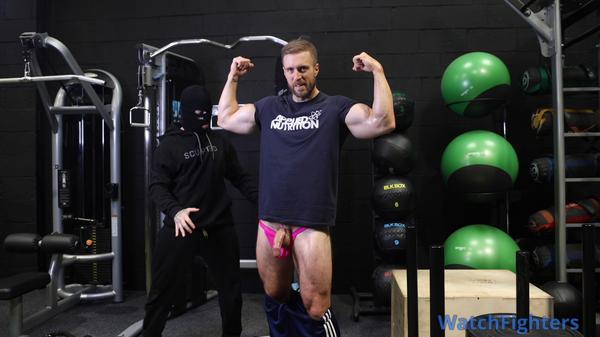 In this video, one guy arrests the other, and punches him in the abdomen and also punches and kicks him in the balls while handcuffed. Then on the bed, he attaches a leg separator so the guy can't escape the blows to the balls.