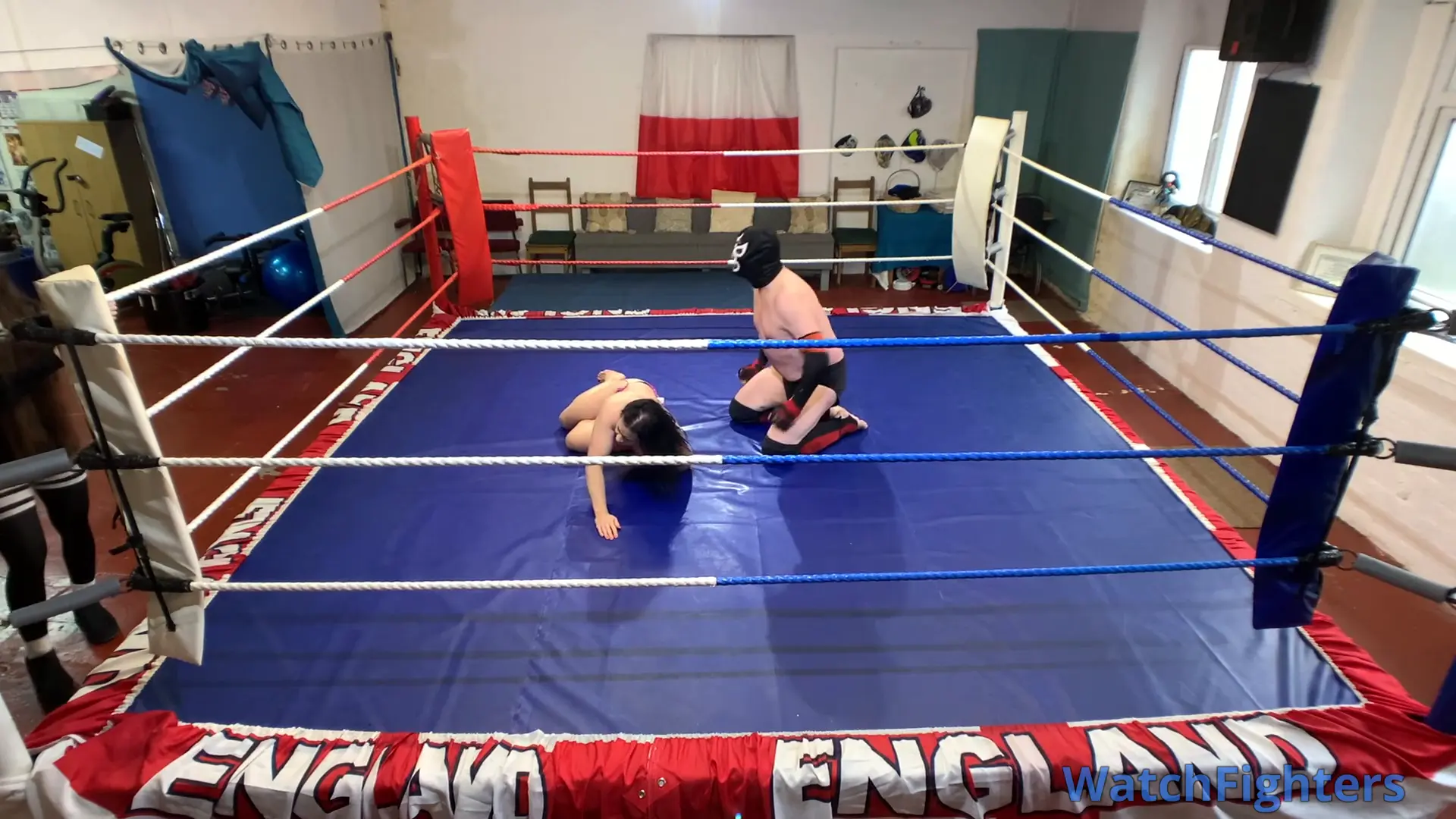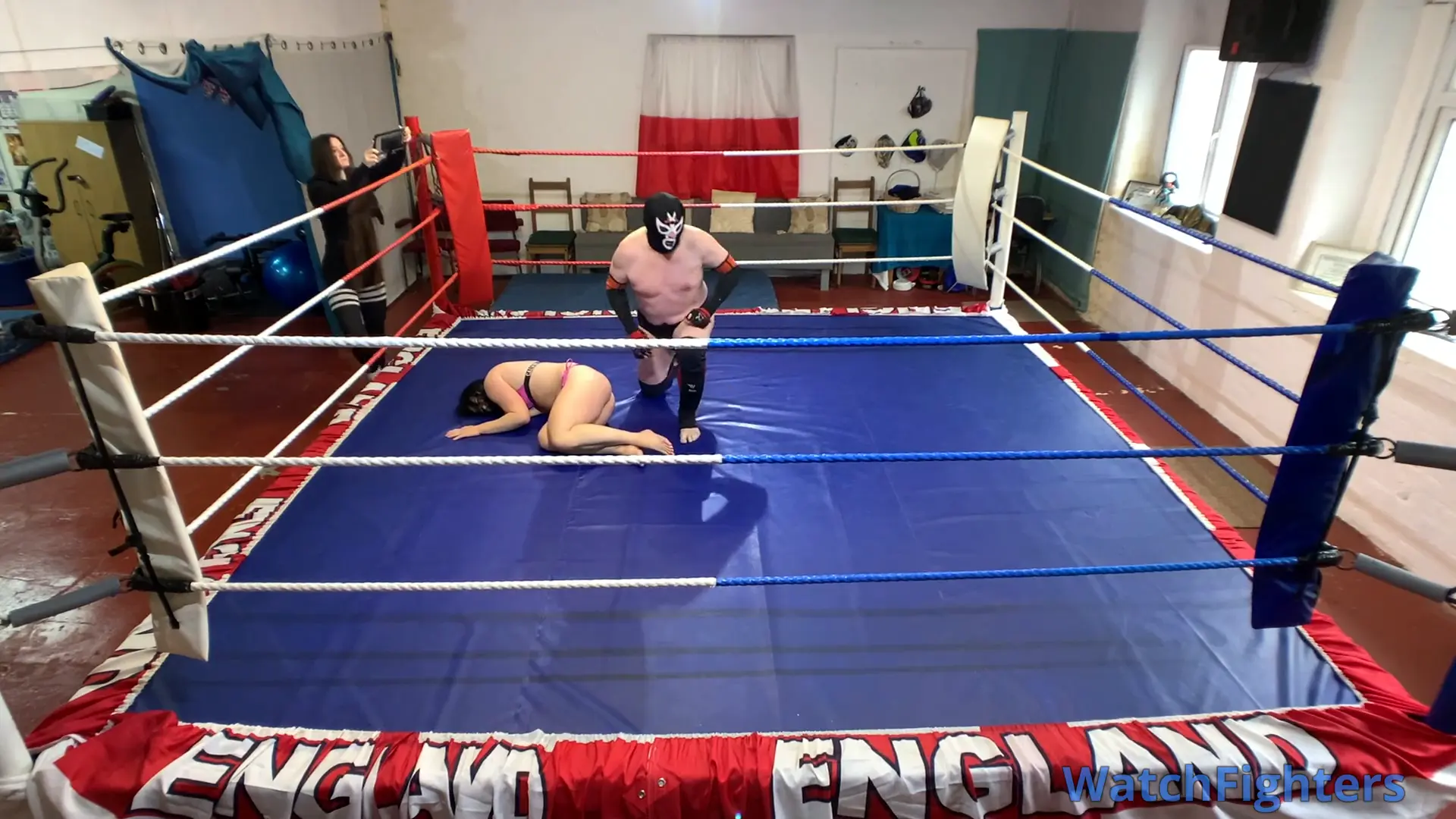 Action from a pro style mixed match featuring the strong female session wrestler, Raven v Ghoul held at TWF Manchester.