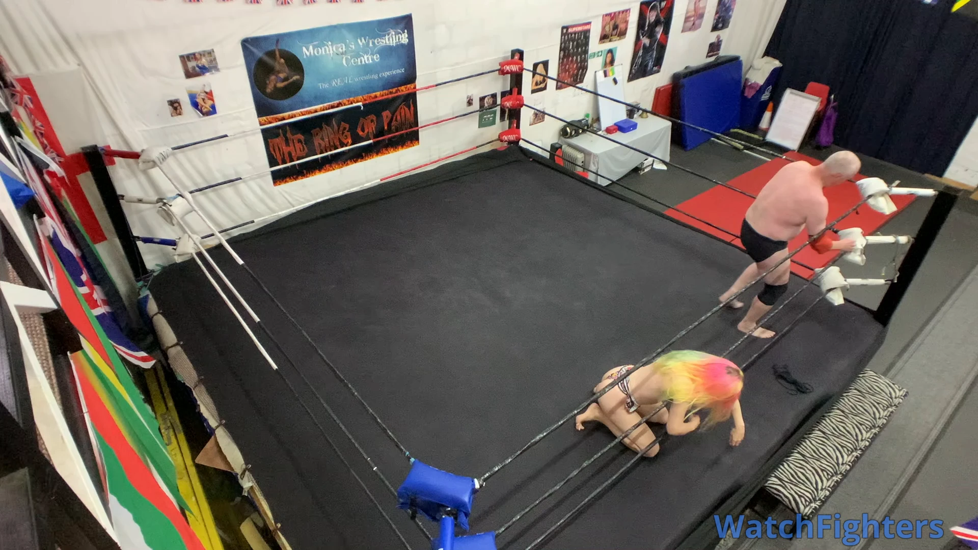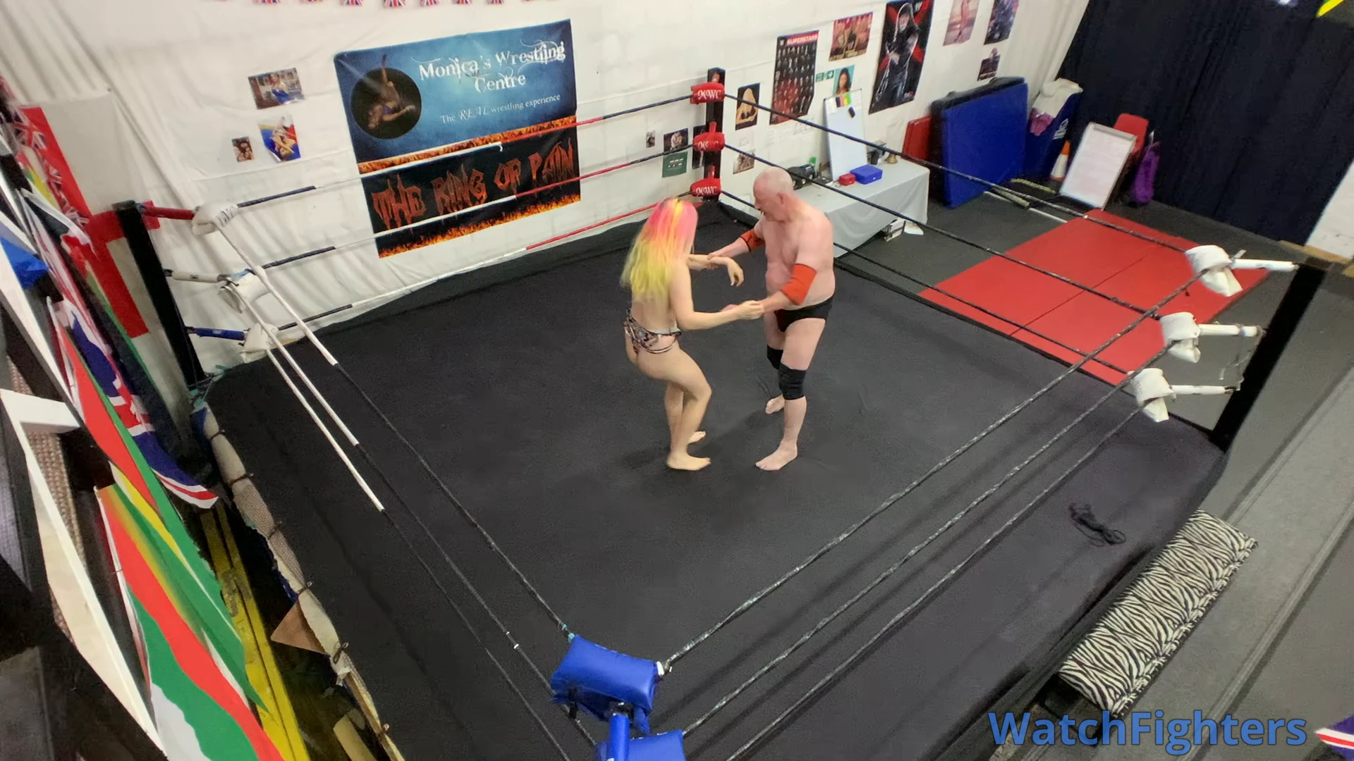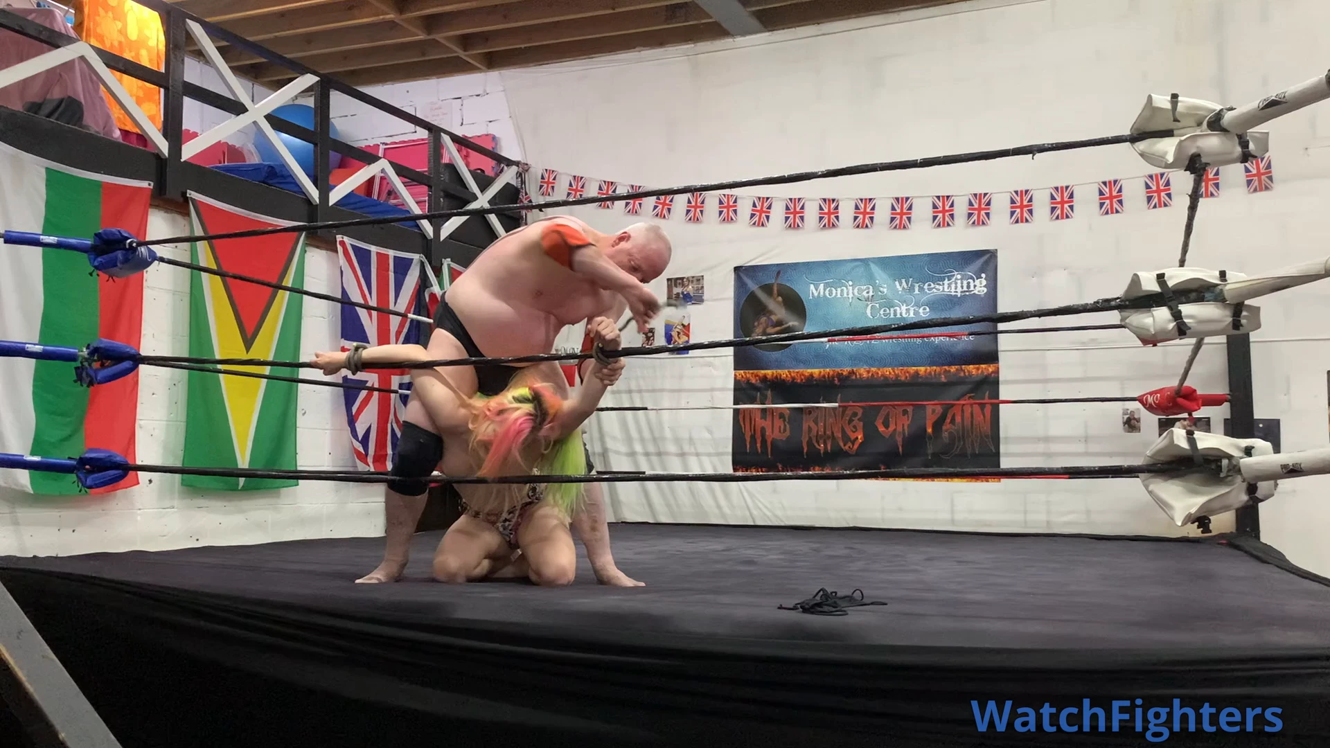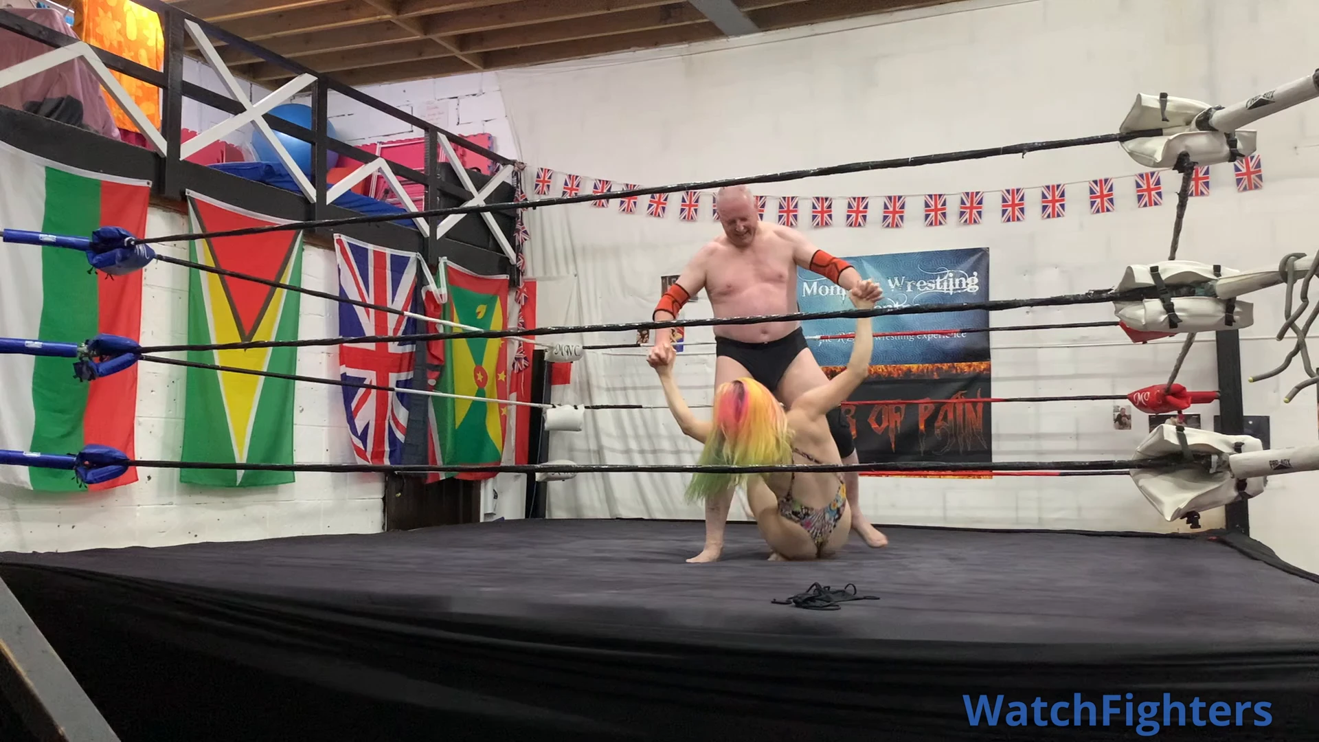 Action from a pro style wrestling rematch featuring trans female session wrestler Kat v Stephen held at MWC London