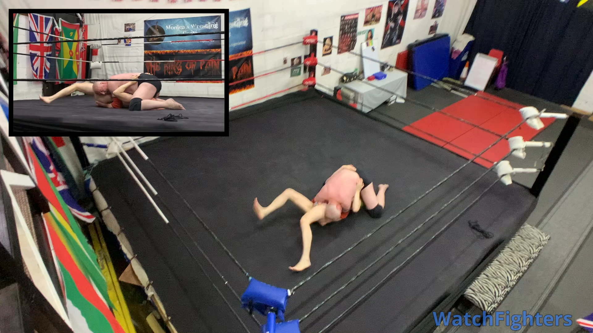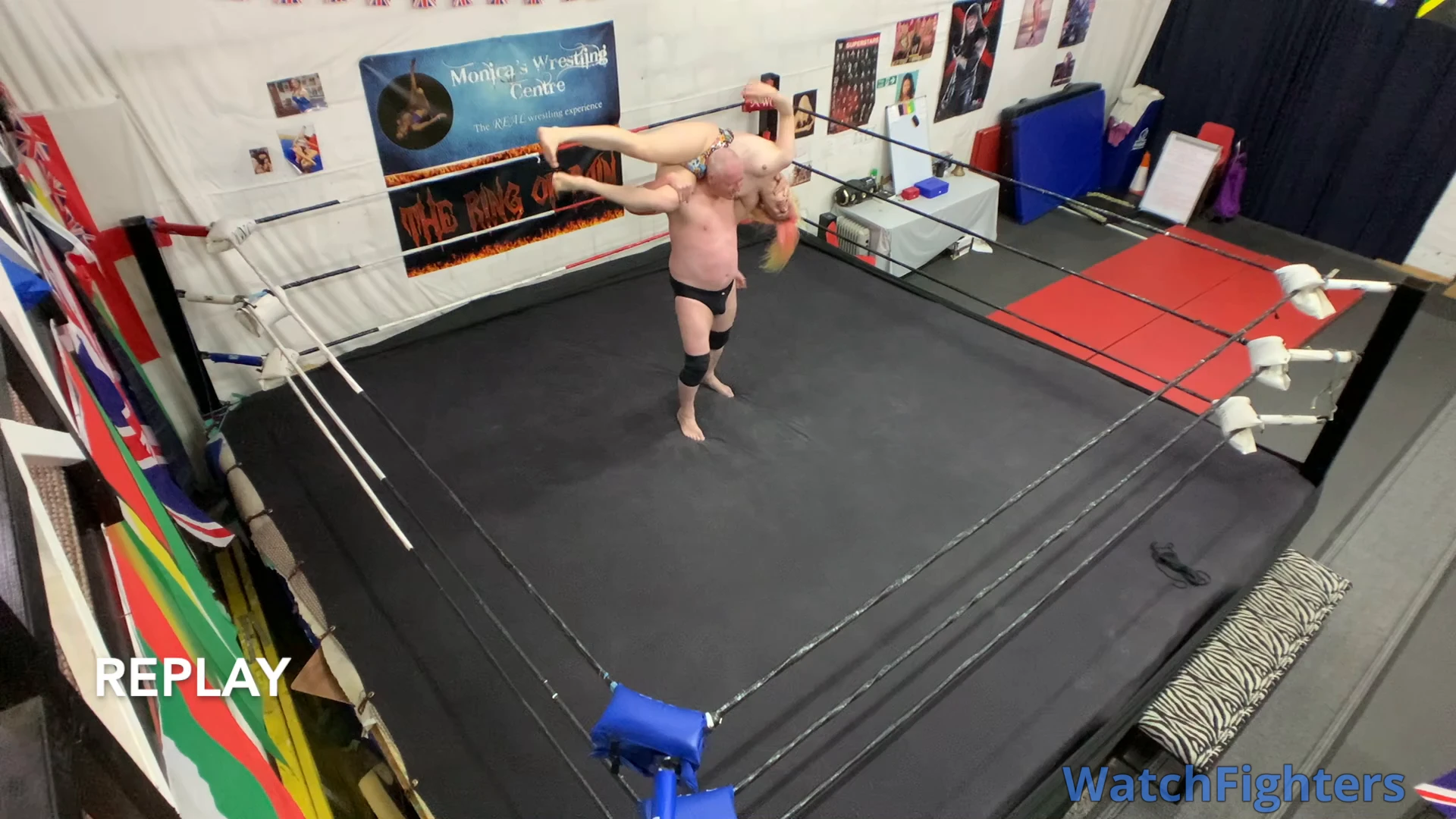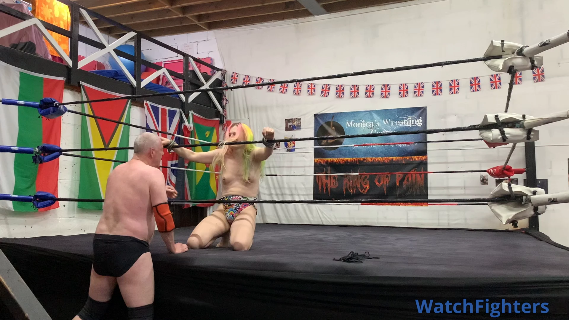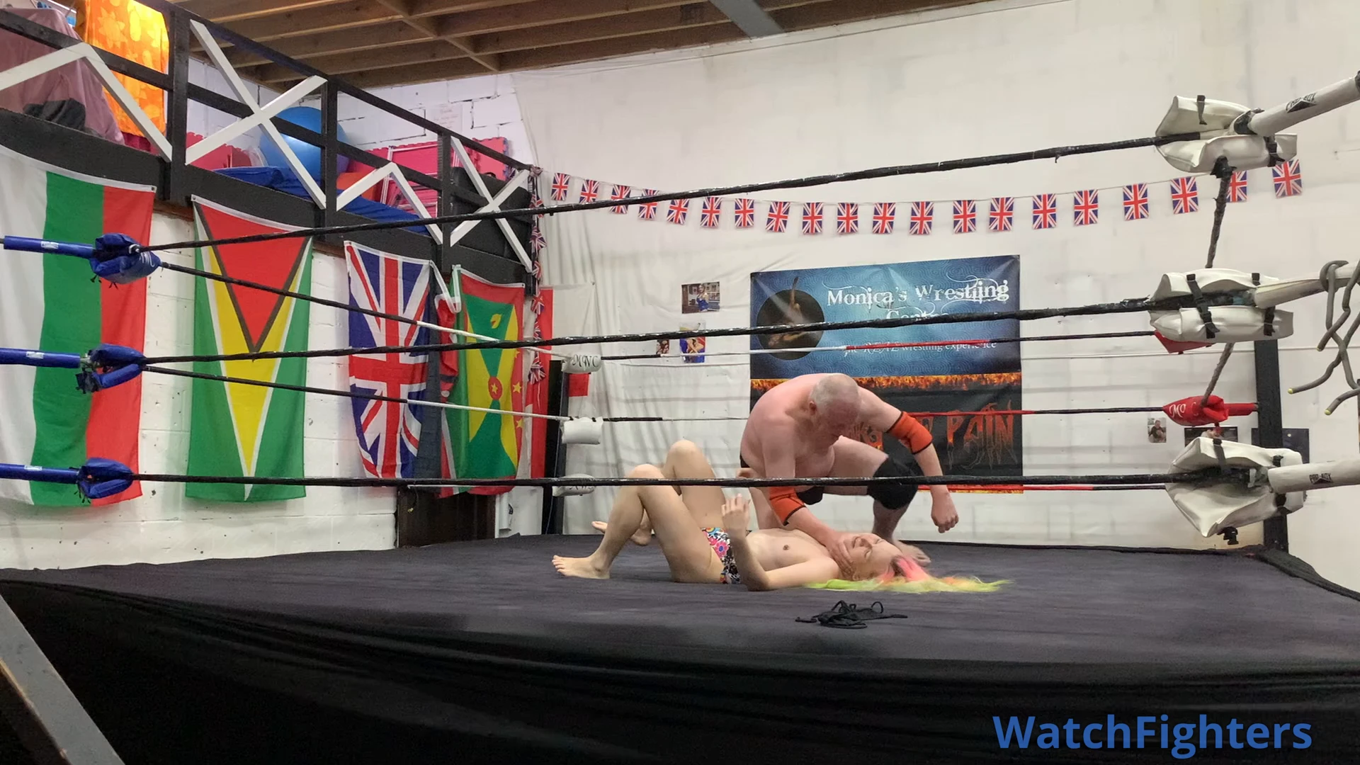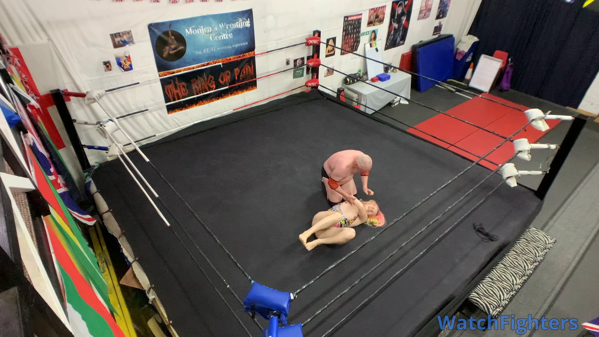 Action from a pro style wrestling rematch featuring trans female session wrestler Kat v Stephen held at MWC London