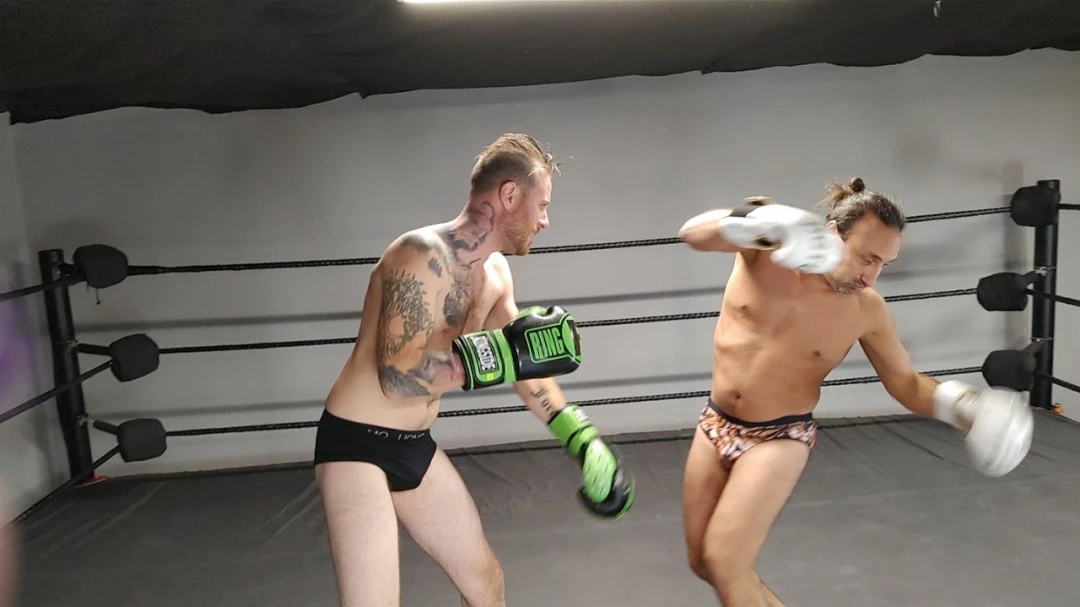 Aaron vs Carlos CUSTOM BOXING VIDEO : one guy hits the mats one after the other. They get up, go at it again. Punches to the face until they go down and it got harder and harder to get up! Battle of the Knockouts in underwear! Spoilers