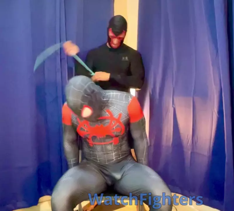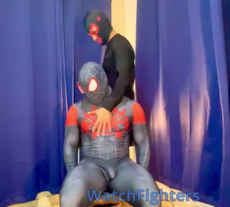 Spidey guy its ambush at home by villain, tie to a chair the villain take advantage of the helpless hero, spidey is handgag, punish and choke several times with no mercy.