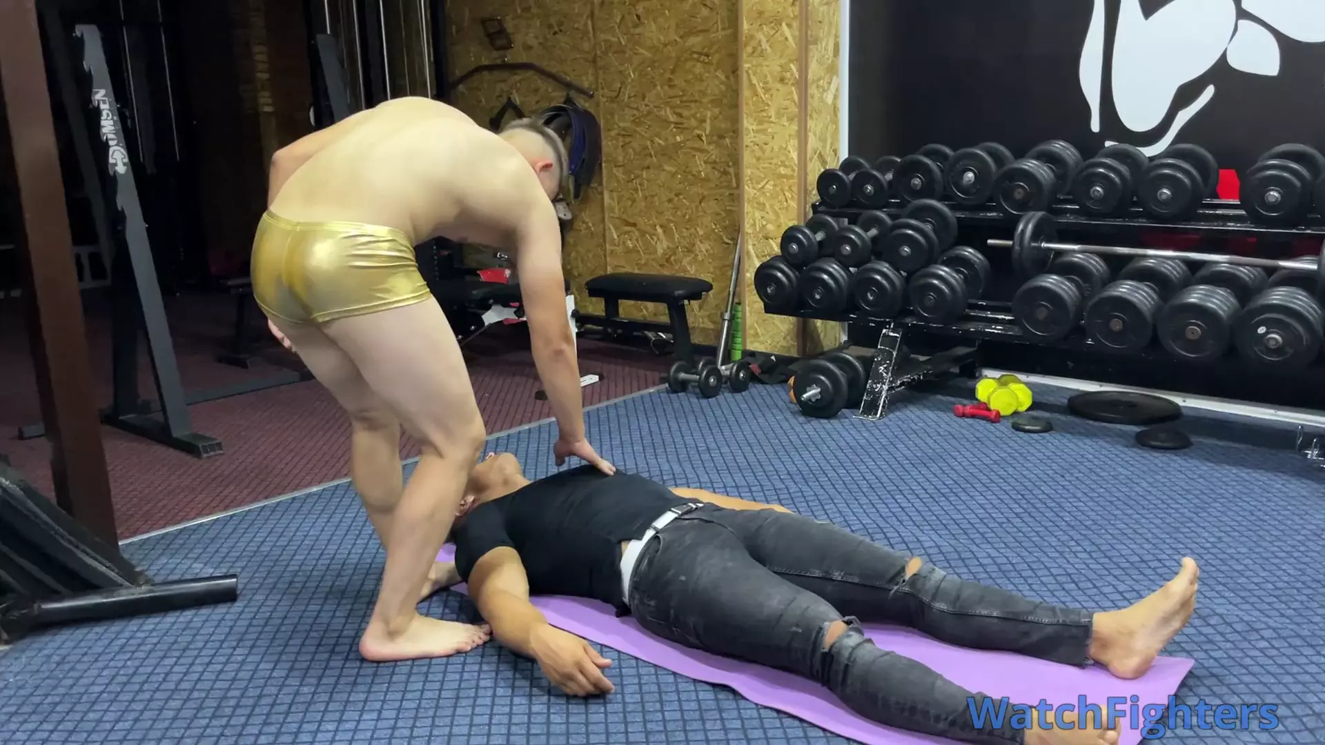 Nicky sneaks up behind Big Alpha at the gym and knocks him out with a chloroform soaked rag. Nicky undresses Big Alpha while he is sound asleep massaging his muscular body. Big Alpha wakes up and gives Nicky a payback he will never forget. Nicky is the one sleeping at the end.