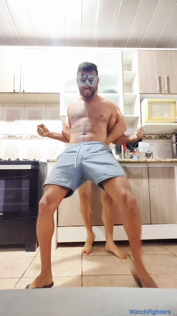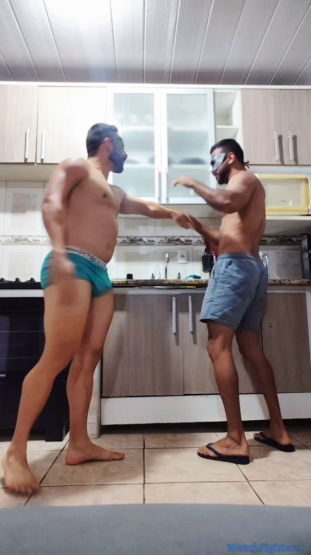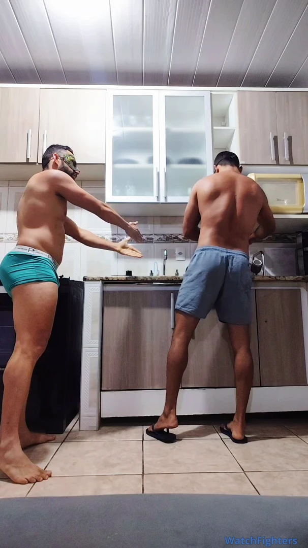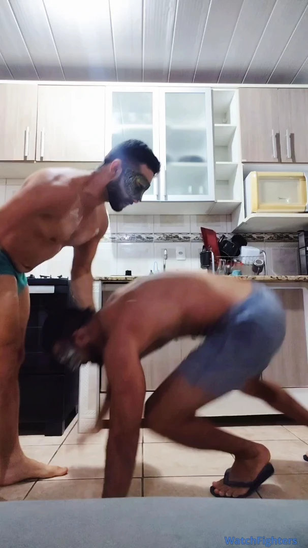 Macho espancando seu primo mais velho e mais alto com chutes e socos profundos em seu estômago