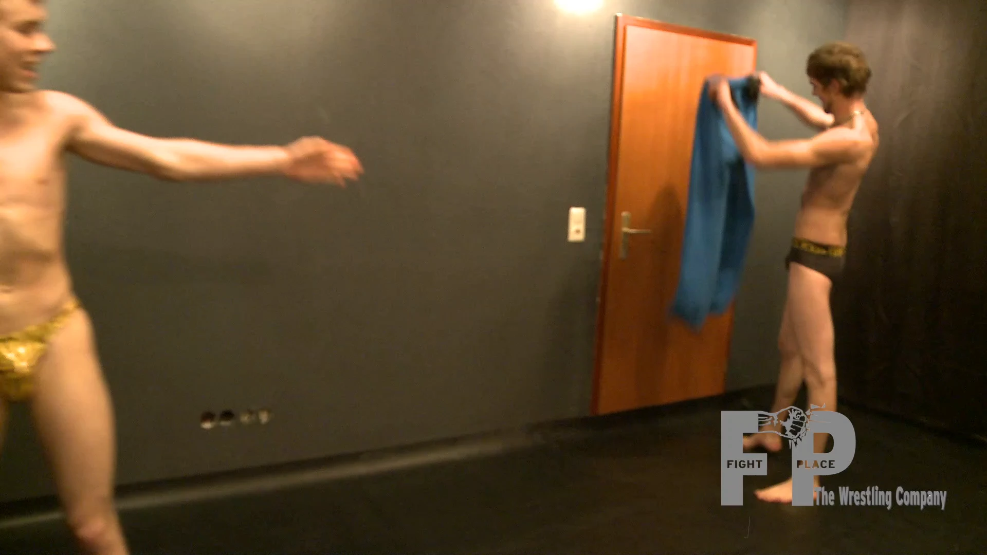 Moe (18) demands a rematch. The defeat against Joe (19) in the boxing ring (Little Beasts) hit his ego hard, and his teammates’ taunts cut deep. He wants to prove he’s no loser. Dressed in a blue Speedo and wrestling boots, he waits for Joe, who appears confidently in gold – shorts and boots matching his claim to be “the best.”