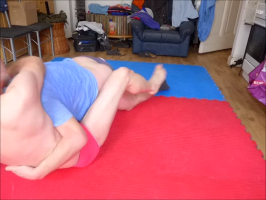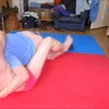 We start standing on the mat. After some struggle I can press "Kleiner Kerl" on the mat, press his head between my thighs. He is helpless, so that I can grab his cock undisturbed. He tries to free himself, which he finally succeeds in. Now he grabs into my pants to my ass. He massages my cock, which I enjoy without resistance.