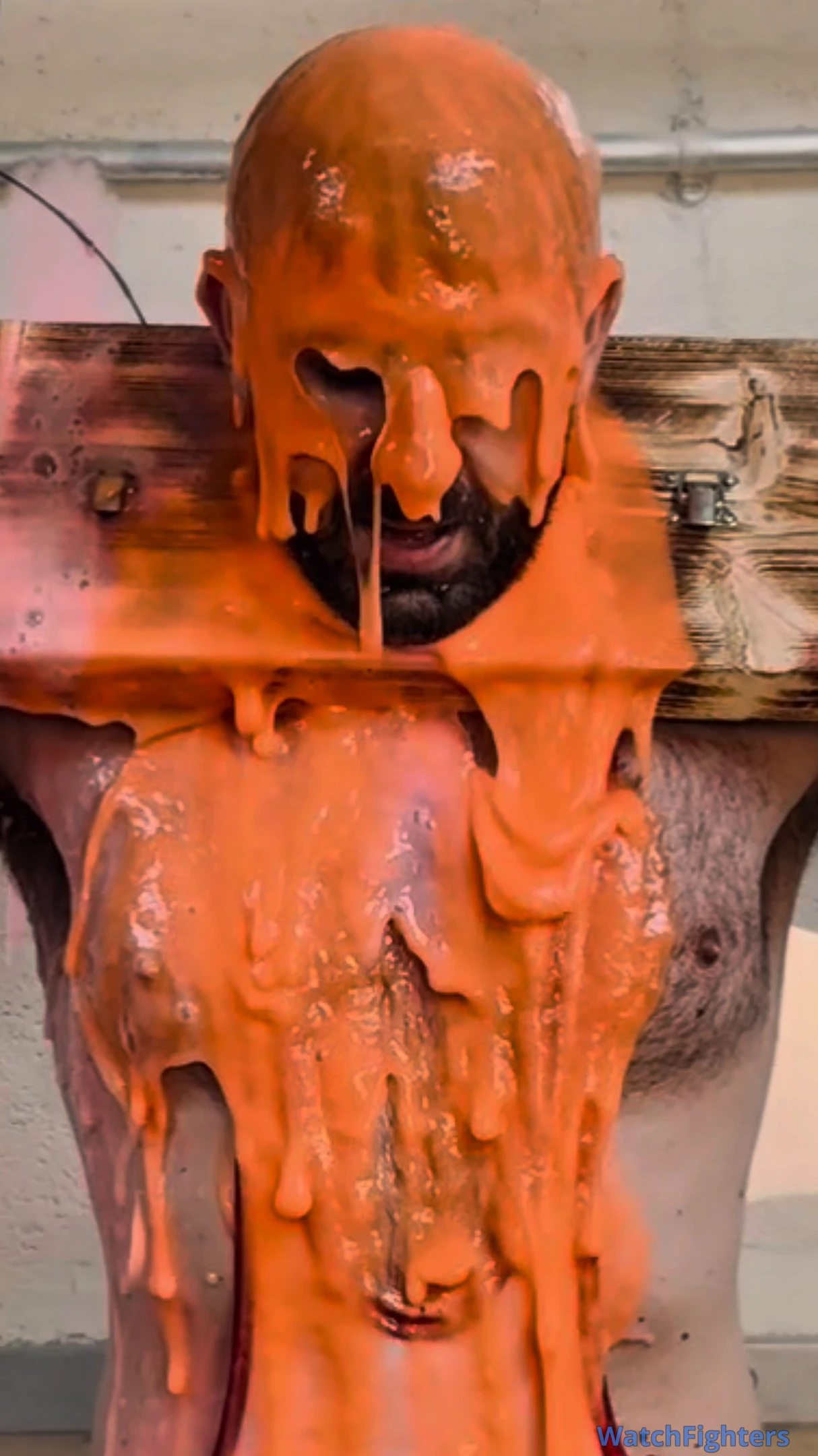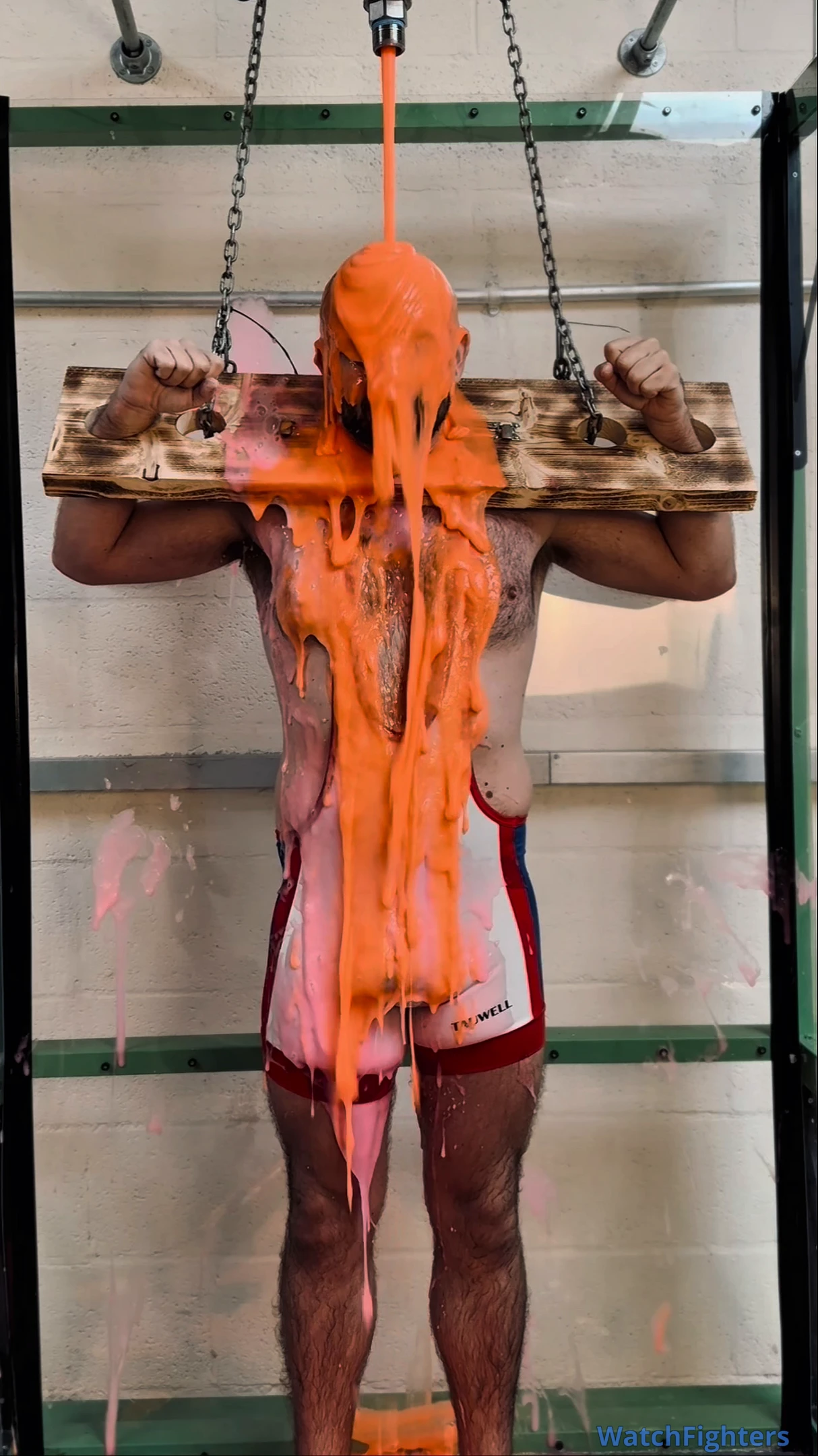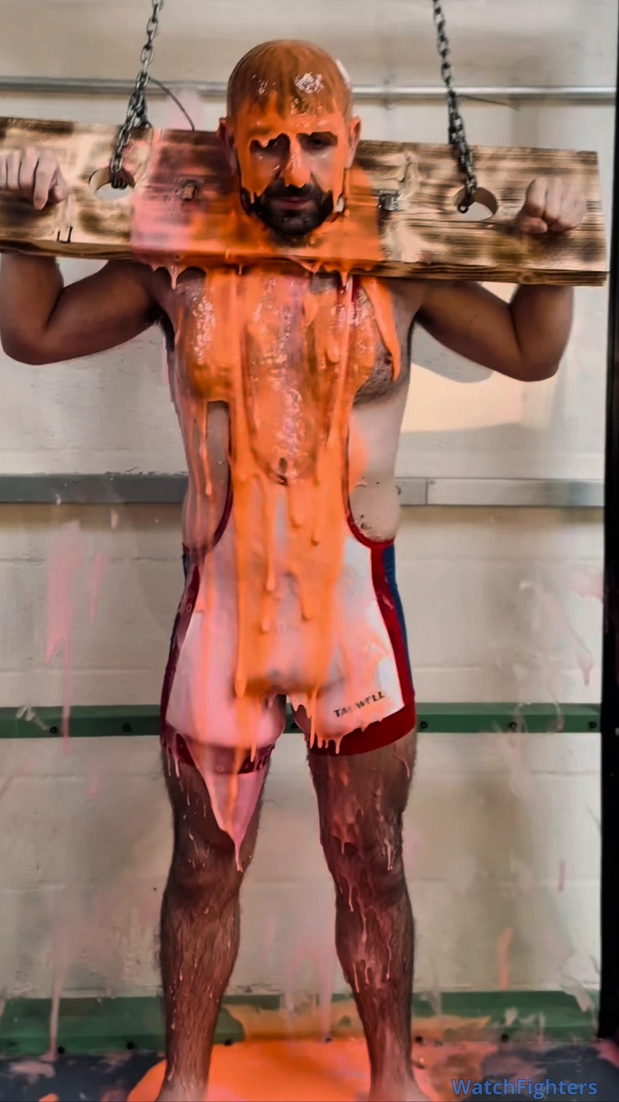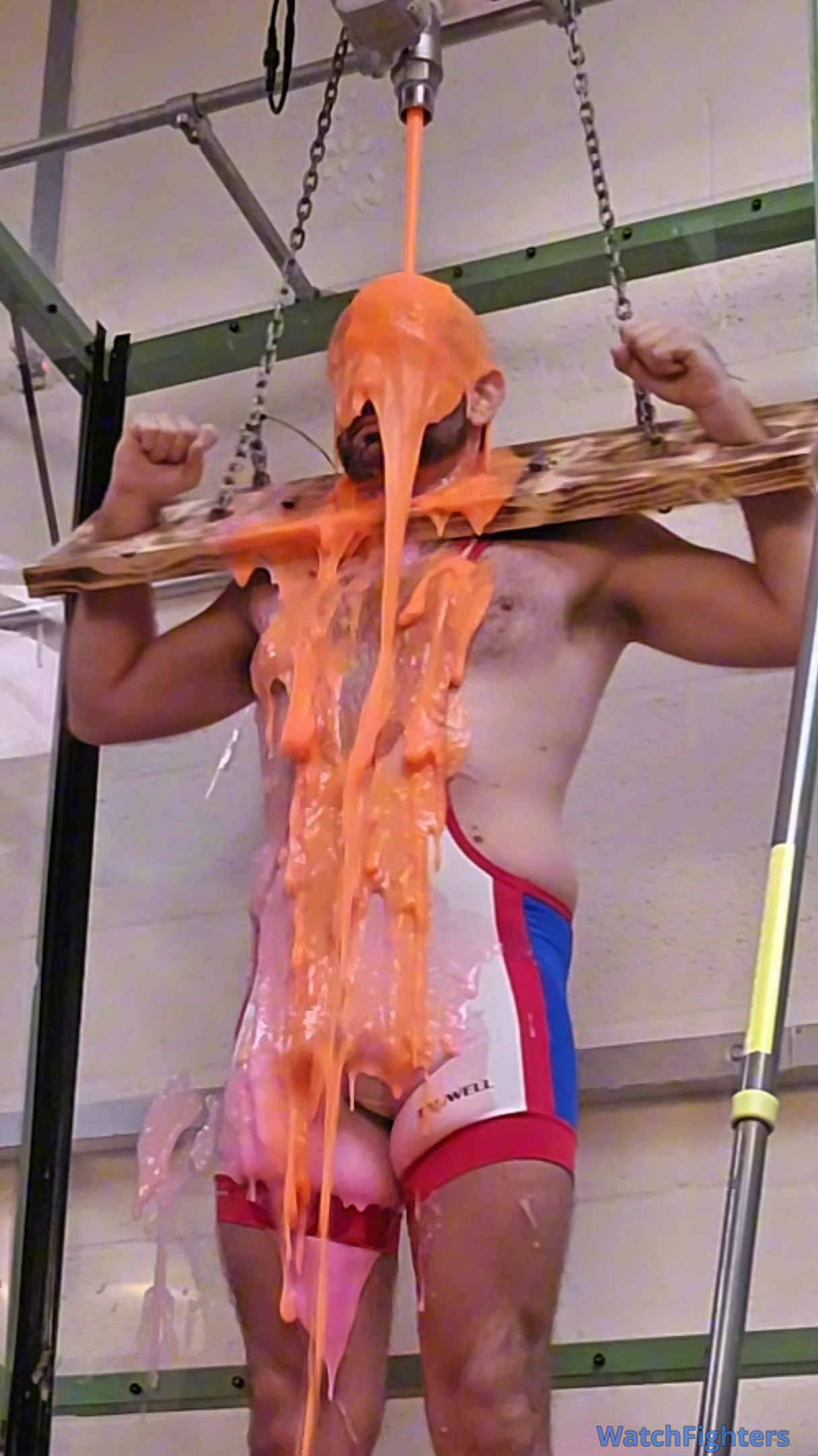 Watch me get covered in goopy slime as I'm restrained in my white singlet. As the warm gunge pours over my head, it gets me more and more worked up. I hope You enjoy my very excited bulge at the end.