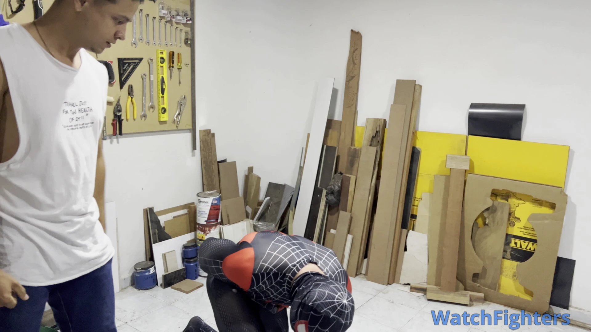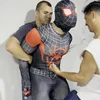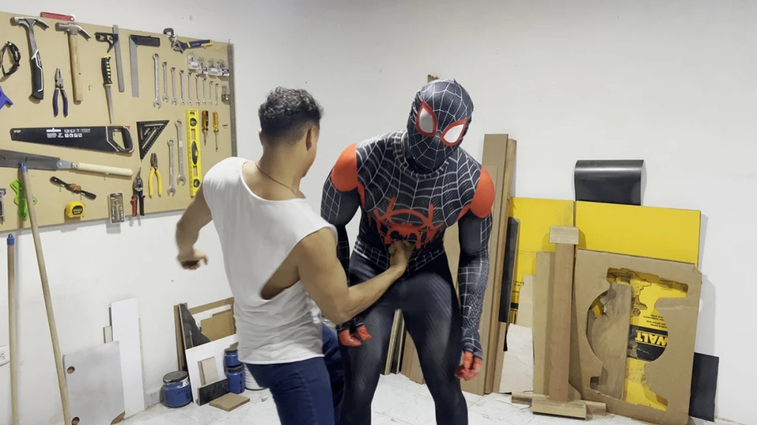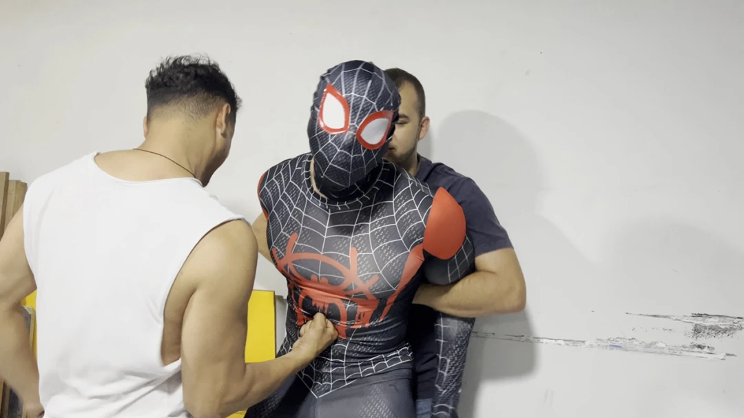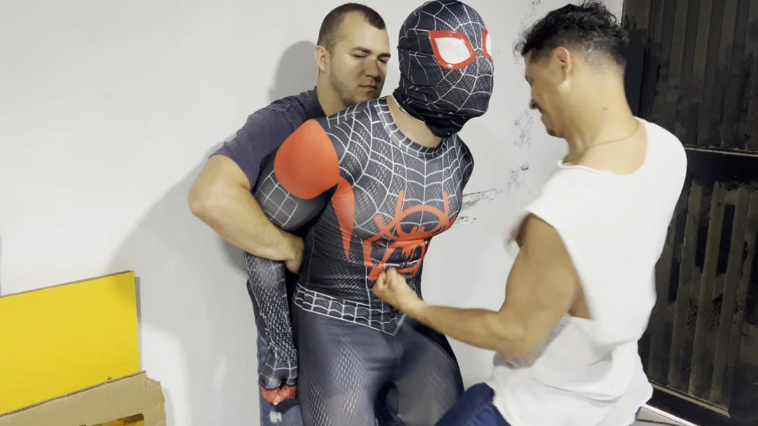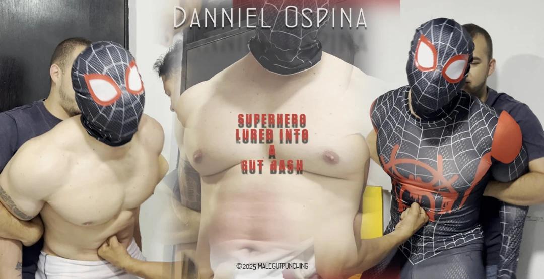 Spider-Man is searching a room based on a message he received about criminal activity. A man sucker punches him in the stomach bringing him to his knees. Another man grabs his arms from behind and the men start giving his muscled abdomen a work over. Will our superhero be able to endure the gut bash?